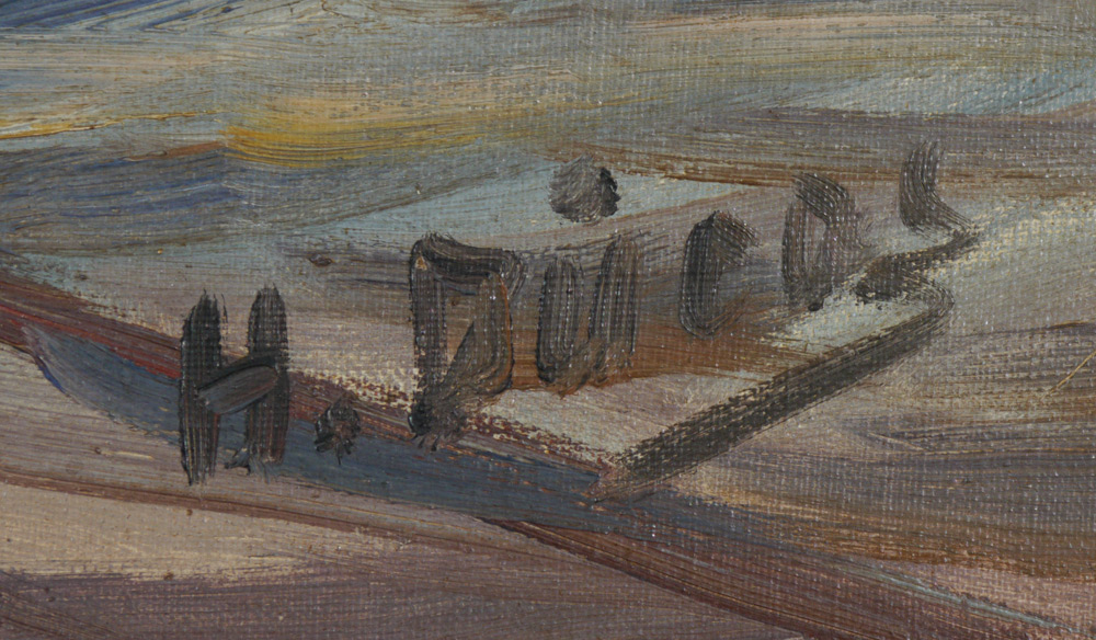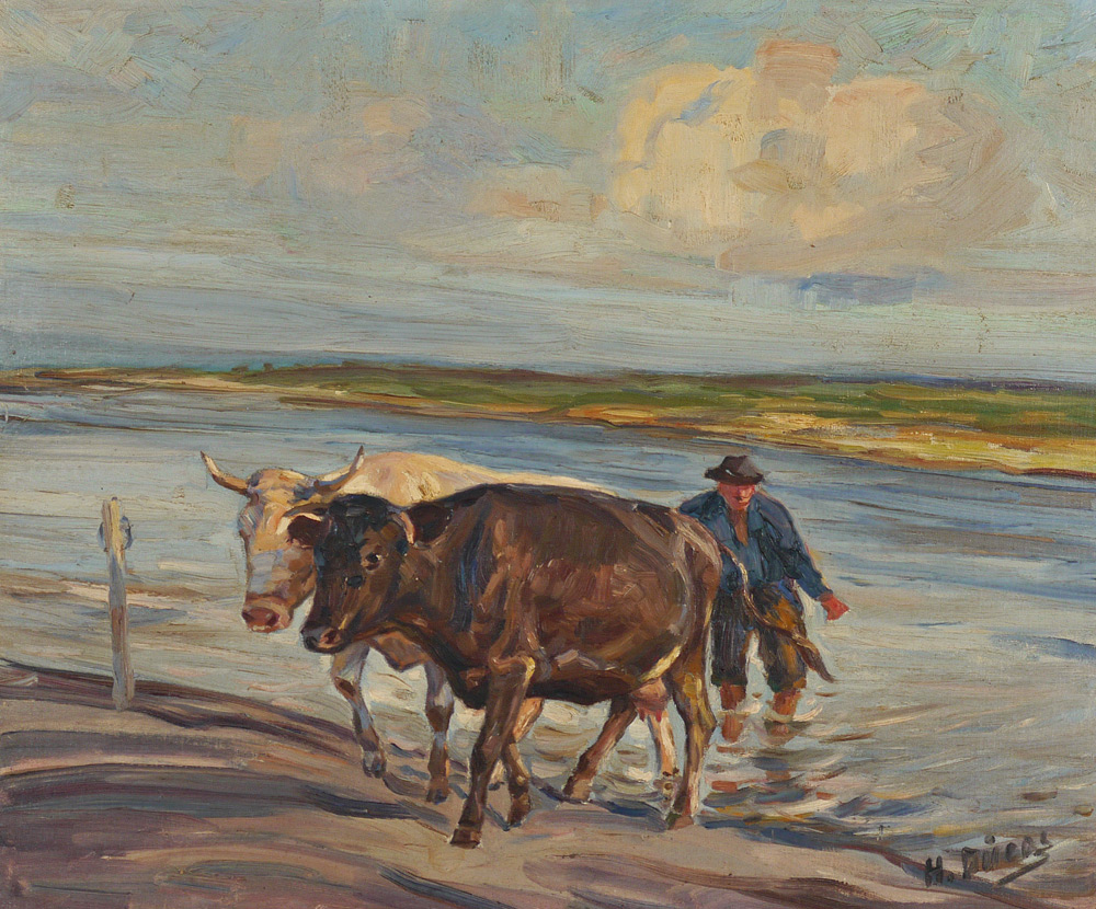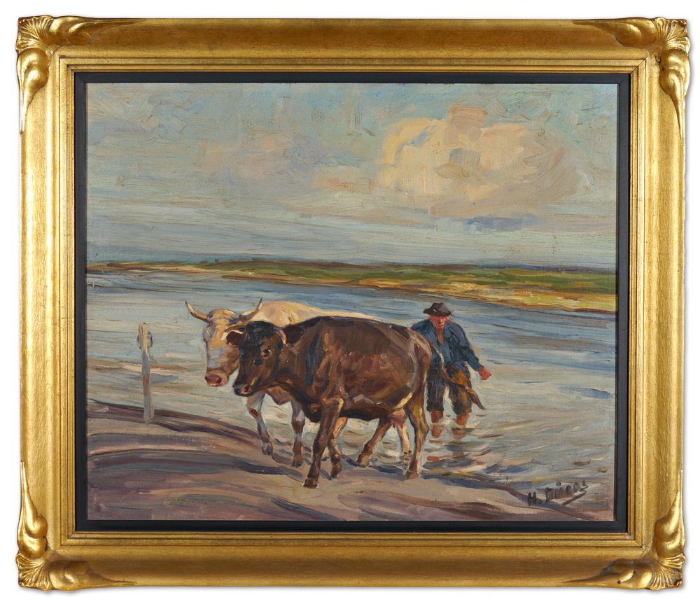 ILLEGIBLY SIGNED IMPRESSIONIST COWS AT SHORE PAINTING: Oil/Canvas, 26'' x 31 1/2'', impressive Nouveau gilded floral motif frame with minor wear, 33 1/2'' x 38 1/2''.