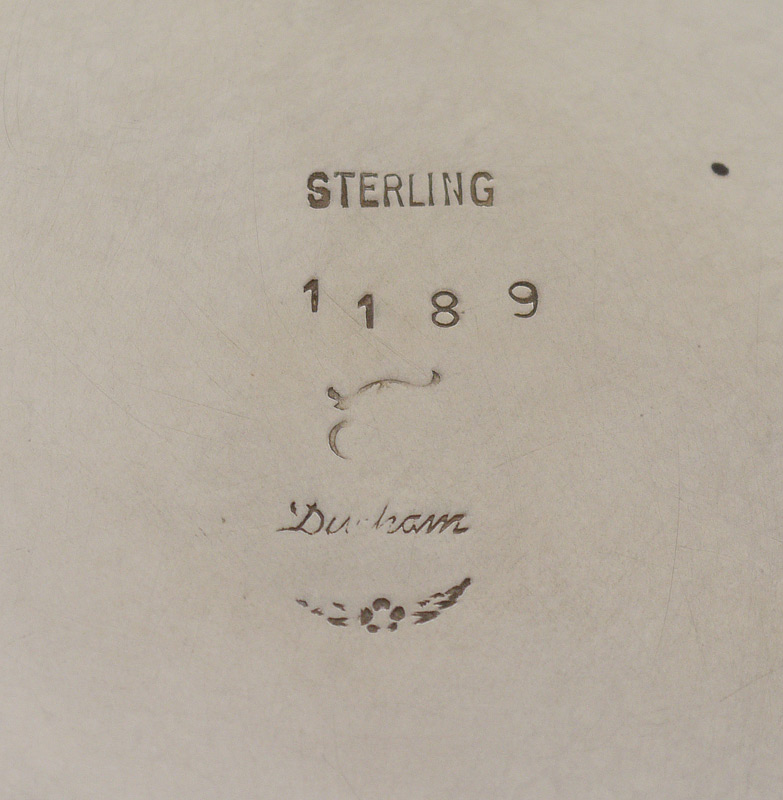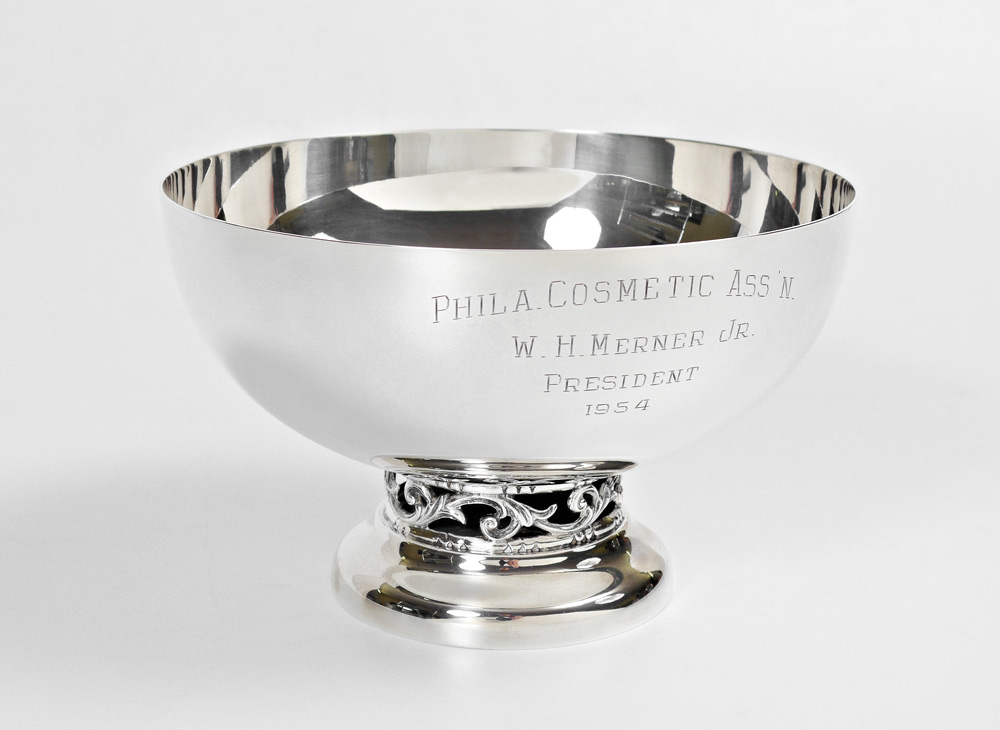 DURHAM STERLING FOOTED PRESENTATION CENTER BOWL: Reticulated footed base, bowl with presentation ''Phila. Cosmetic Ass'n., W. H. Merner Jr., President, 1954''. Marked on base with Durham mark, Sterling, 1139. Measures 5 1/4'' h. x 8 1/2'', Approx. 26.9 troy oz.