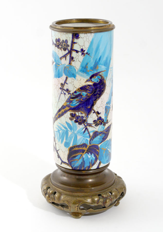 MOUNTED FRENCH FAIENCE VASE: Decorated in shades of blue and gilt with bird of paradise, bamboo and floral decoration in the style of Longwy. Mounted with metal liner, rim and base. Obscured mark on bottom with ''H'' visible. Overall 11'' h. x 5 1/4''.