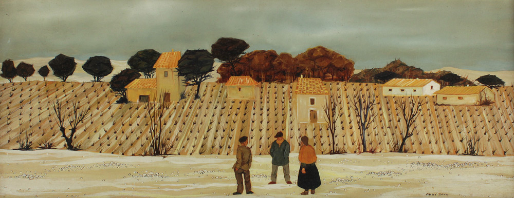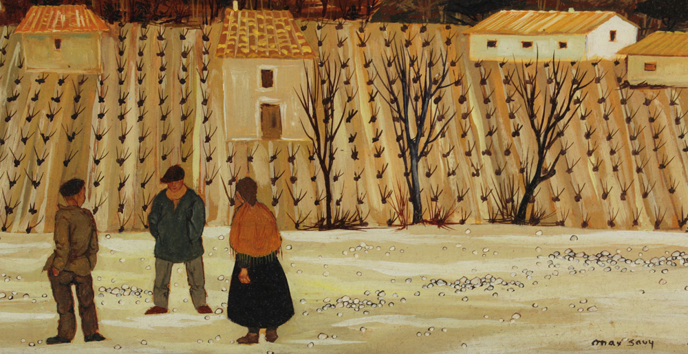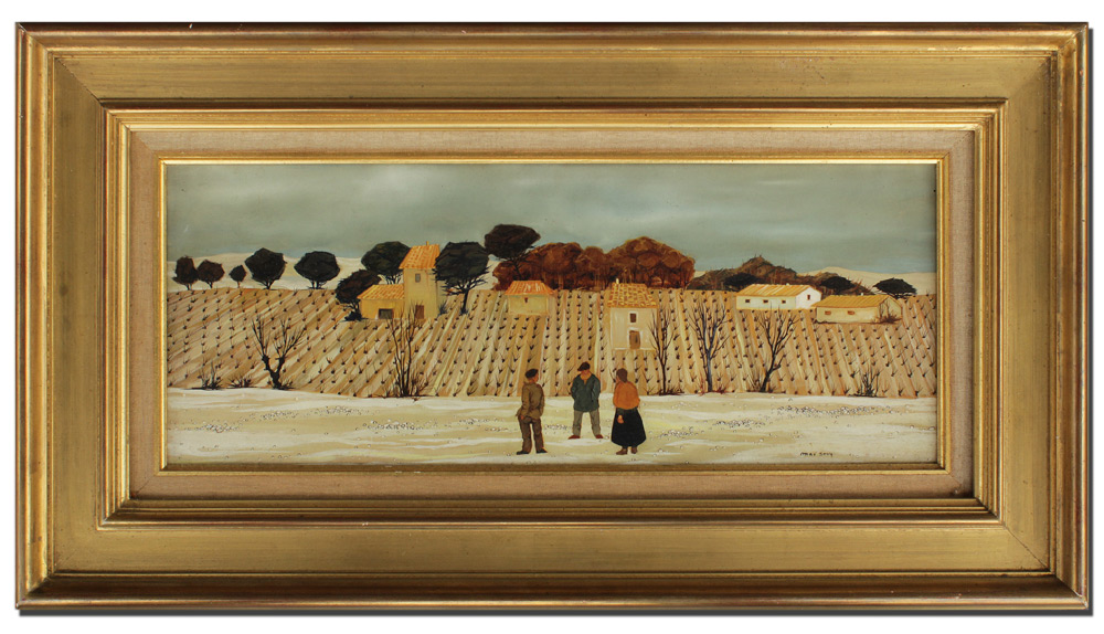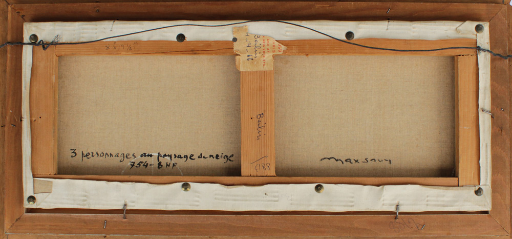 SAVY, Max, (French, 1918-2010): ''III Personnages au Paysage de Neige'', Oil/Canvas, 8'' x 19 5/8'', signed lower right, encased in original gilded frame with minor wear 14 1/2'' x 26'', titled and signed verso.