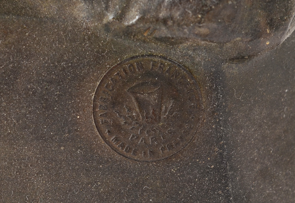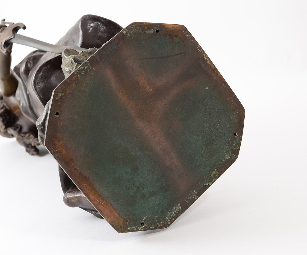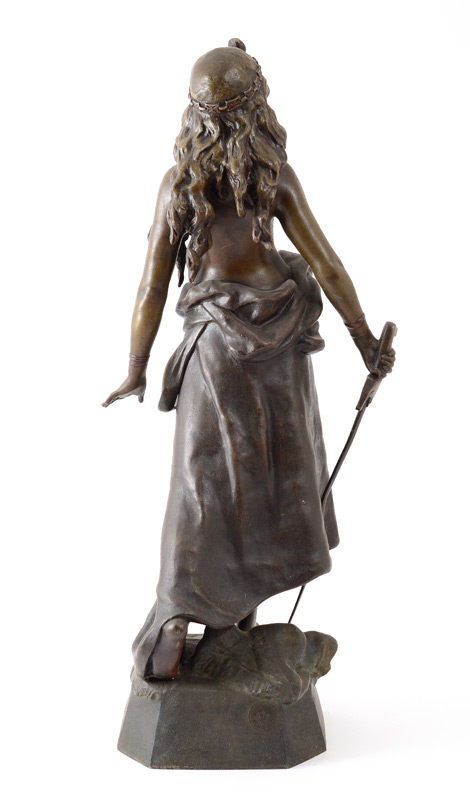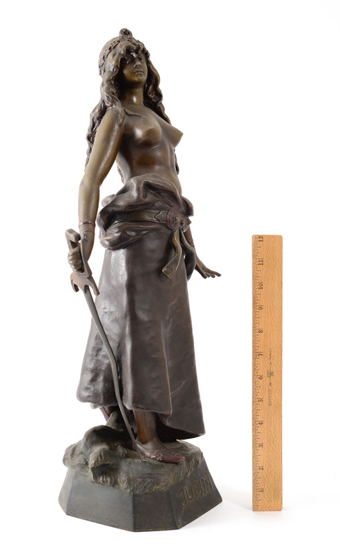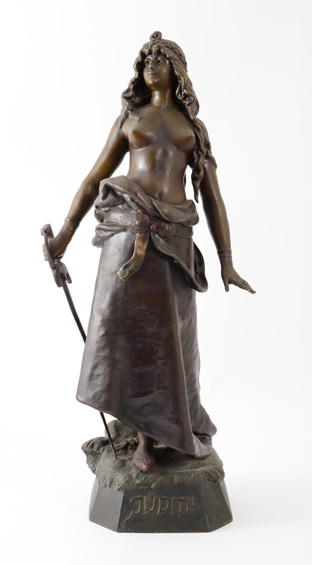 JUDITH SPELTER SCULPTURE AFTER MOREAU: Patinated Sculpture of the Scantily Clad Warrior Maiden Judith, measures approximately 20 1/2'' h., incised signature and stamped fabrication France', impressed mark verso.