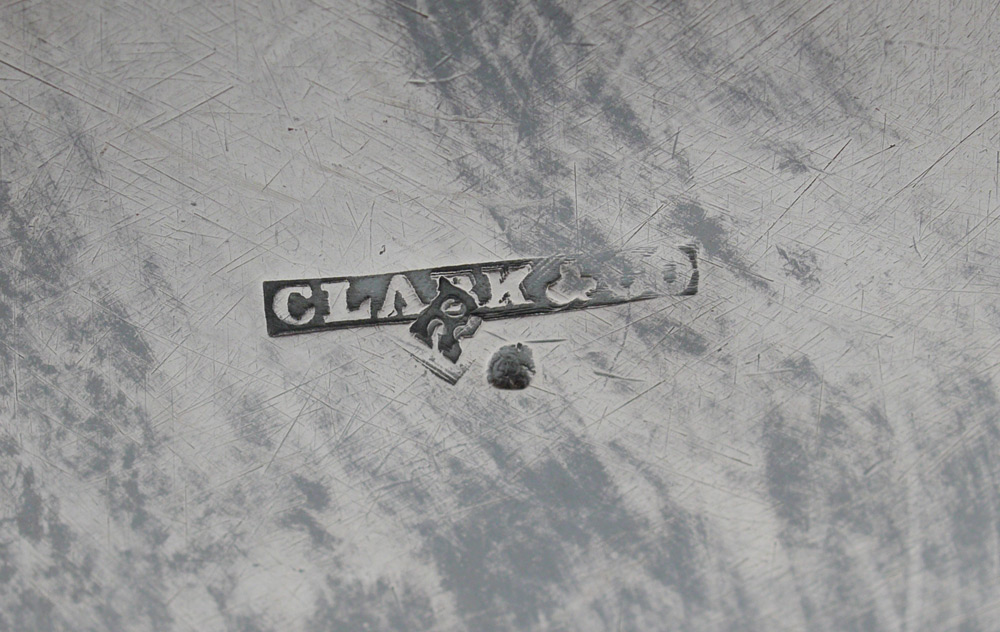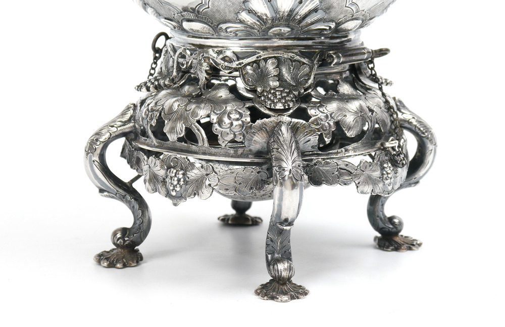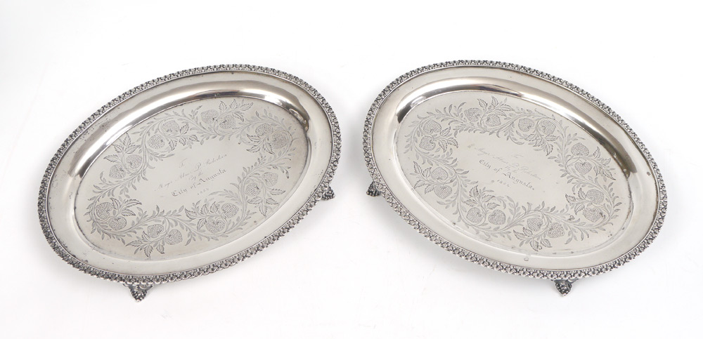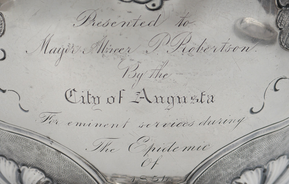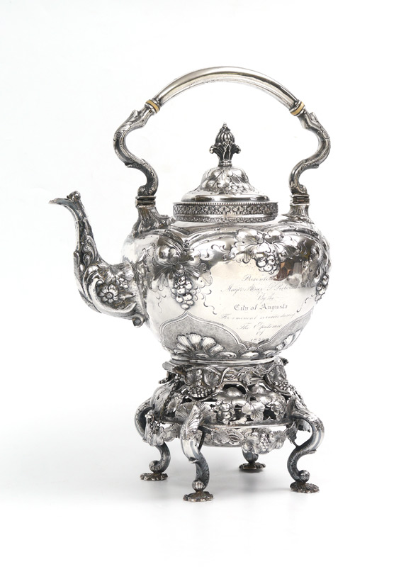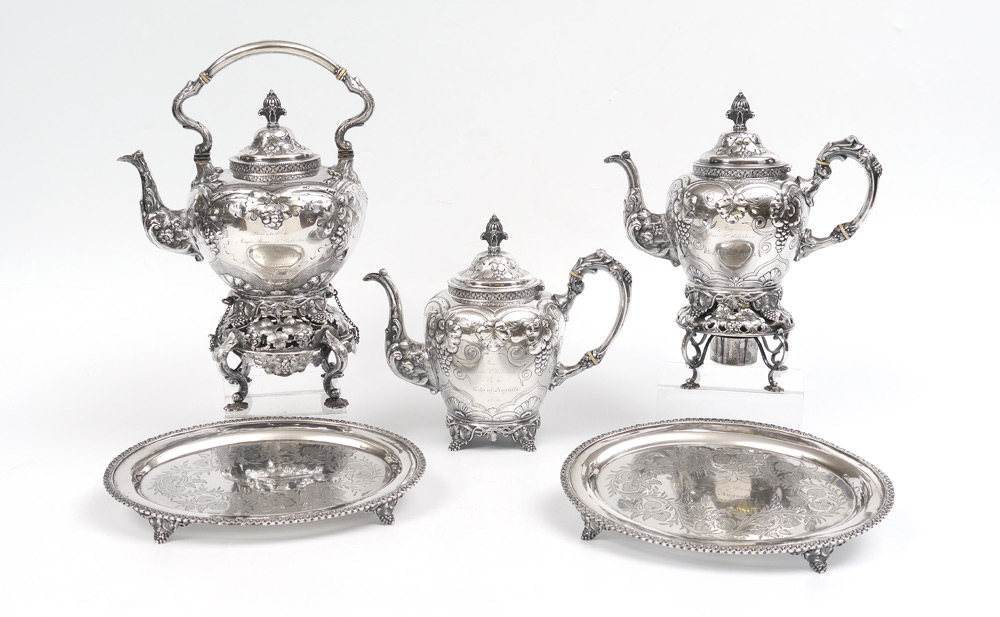 IMPORTANT 1854 CLARK & CO. COIN SILVER TEA SERVICE: 3 piece tea service by noted 19th century silversmiths Clark & Company of Augusta, with presentation on each piece ''Mayor Abner P. Robertson, By the City of Augusta, 1854''. Each piece with chased foliate and grape vine motif, hinged lid with finial. To include 1) Hot water kettle with stand & original burner, articulated handle with bone heat shields. Overall 13 3/4'' h. x 10 1/2'' x 8 1/2''. 2) Coffee pot, 9 3/4'' h. x 11 3/4'' x 6 1/4''. 3) Tea pot, 9'' h. x 11 1/2'' x 6 1/4''. 4) Additional stand for tea and coffee pots with original burner, 4'' h. x 6 1/2''. Sold with 2 footed trays with same presentation, engraved berry design, unmarked as to maker. 1 1/4'' x 12 1/4'' x 9 3/8''. Approx. 168.9 troy oz.