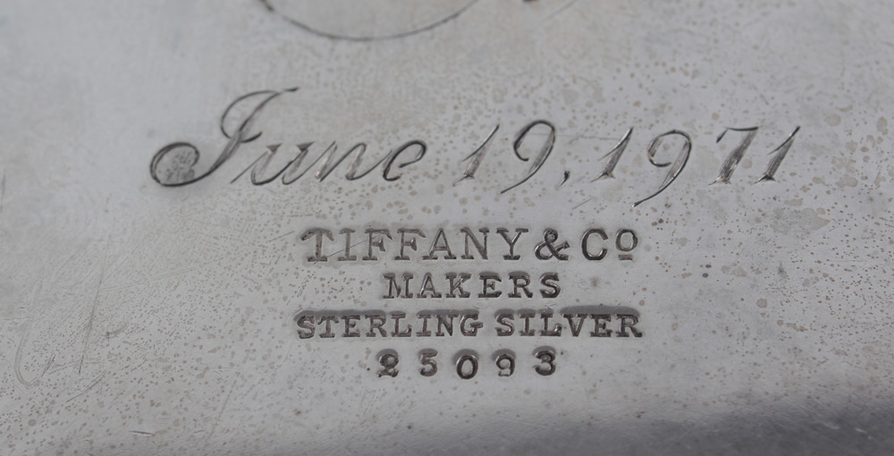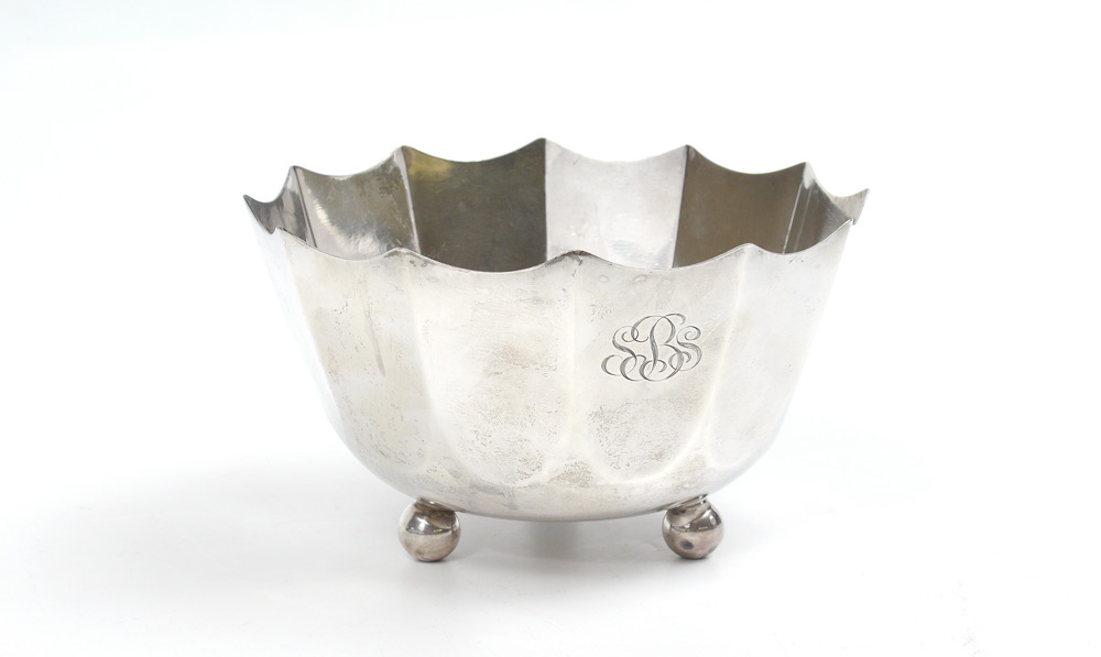 TIFFANY & CO. FLUTED STERLING BOWL: Fluted sides with scalloped rim, on 3 ball feet. Monogrammed on side, dated June 19, 1971 on base. Marked ''Tiffany & Co. Makers, Sterling Silver, 25093''. 4 1/4'' h. x 7 1/8'' dia. Approx. 15.7 troy oz.