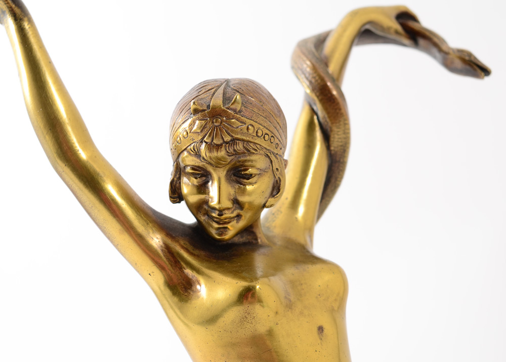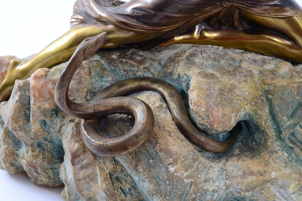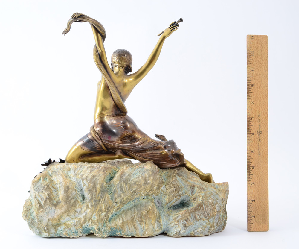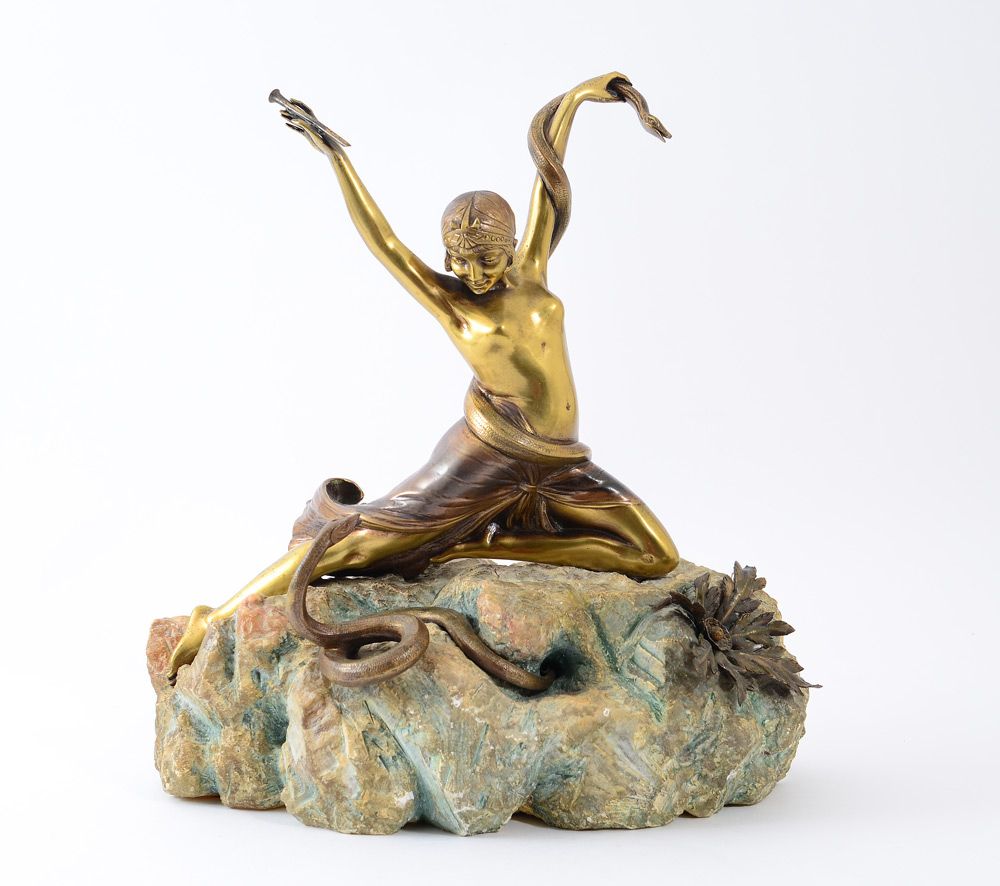 DECO PERIOD BRONZE NUDE SNAKE CHARMER DANCER SCULPTURE: Kneeling semi nude female dancer holding a flute, with one snake wrapped around her arm and another coming out of the ''rock'' to which she is affixed. Base, accented with bronze flora adornment, is plaster carved and color washed to appear as marble. 13 1/2''h. x 13''w. x 6''d. Lot 412 tag on bottom for Christie's London auction Nov 10, 2000, sold for $5048.