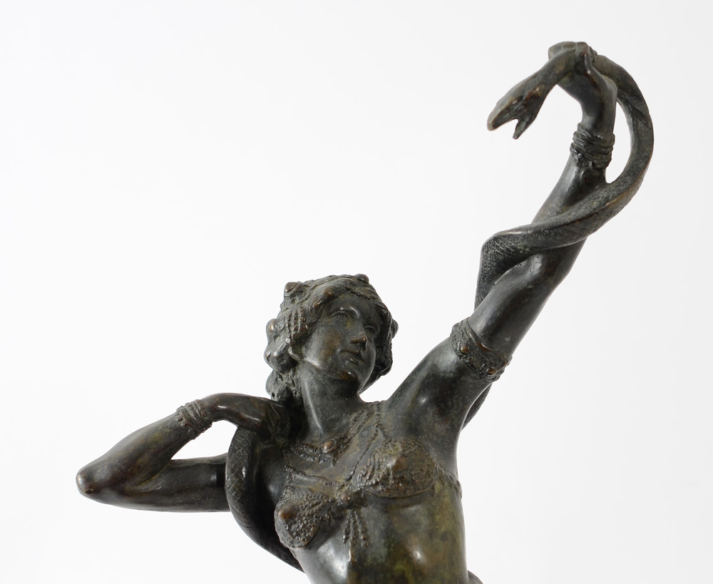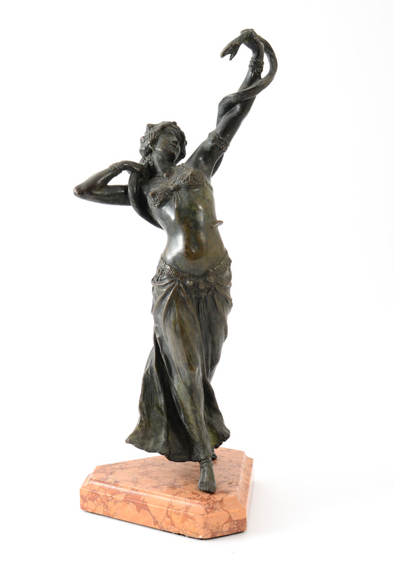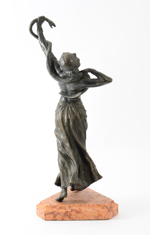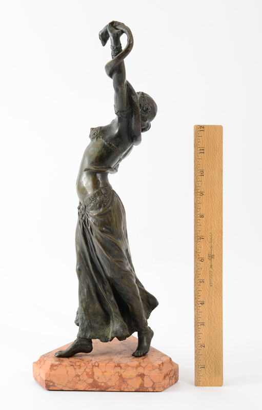 BRONZE ORIENTALIST SLAVE DANCER/SNAKE CHARMER: In the style of Barrias, 15 1/4'' h. x 6 1/2'' w. x 6 1/2'' d., no visible signature, affixed to beveled pink triangular plinth, overall 16 1/2'' h.
