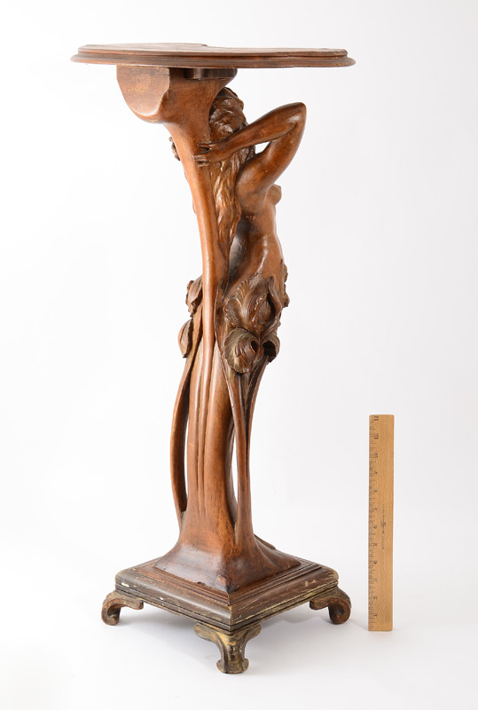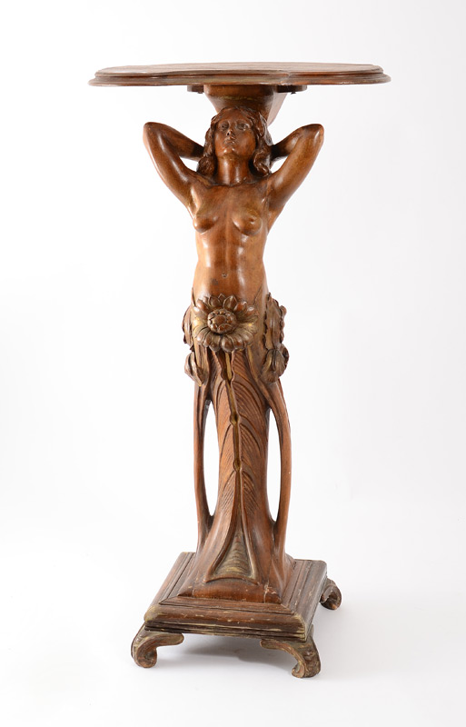 CARVED NUDE NOUVEAU PEDESTAL TABLE: Female nude rising from flowers supporting shaped table, 30 3/4''h x 16'' x 12'' approx.