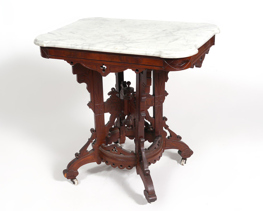 RENAISSANCE REVIVAL VICTORIAN PERIOD MARBLE TOP LAMP TABLE: Cookie corner white marble top on carved walnut base with incised decoration. Unusual circle form joins the legs. Measures 29'' tall x 21'' x 29''.