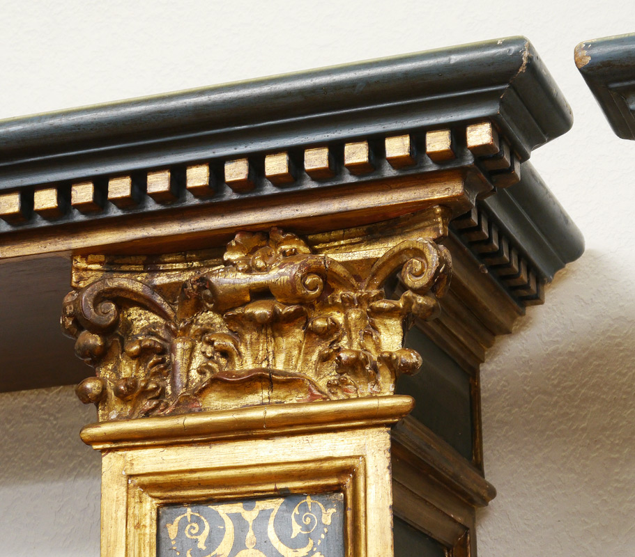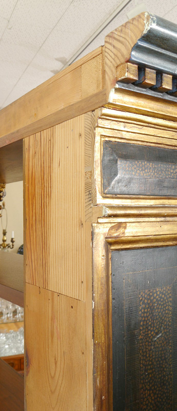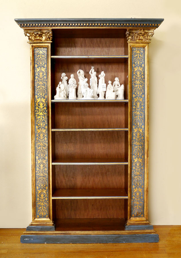 STRONG ARCHITECTURAL DETAIL BOOKCASE: From Salamanca Spain. Corinthian column front stiles under dentil molding, 5 adjustable shelves, gilt decorated stenciling on the front and sides. 88'' h. x 57'' x 15''. For the match see next lot 1109.