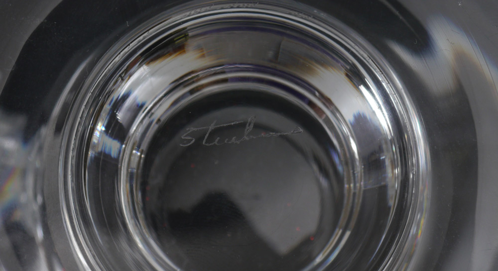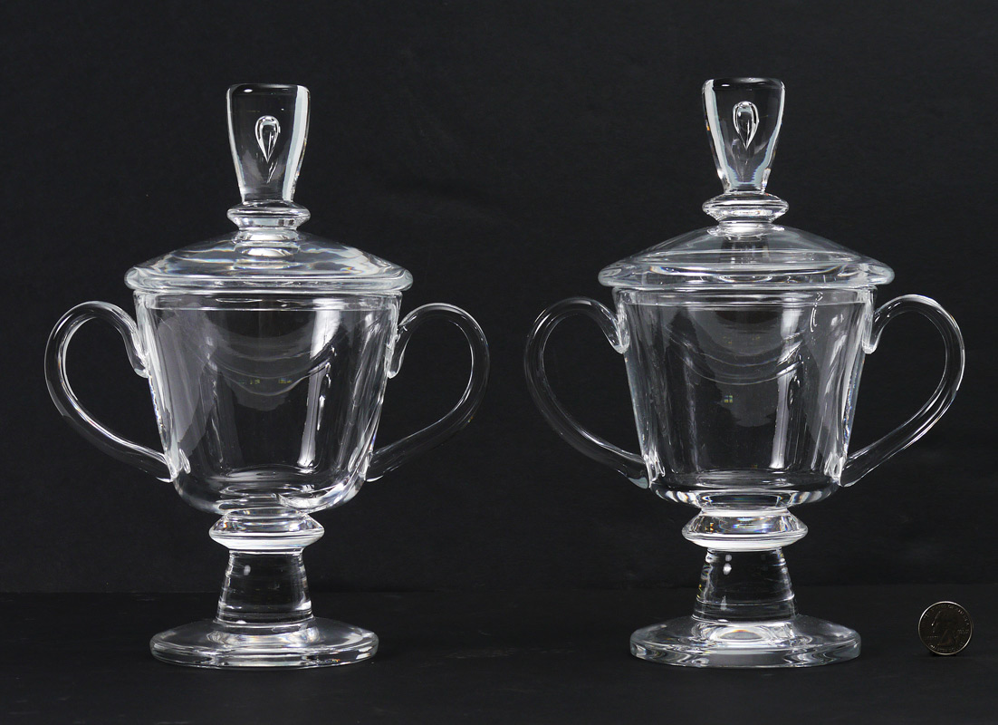 PAIR STEUBEN TEARDROP COVERED URNS: Lid with suspended teardrop in handle, double handled body, signed on foot. Original design by Lloyd Atkins. Overall 10'' h. x 8''.