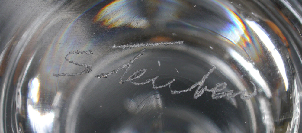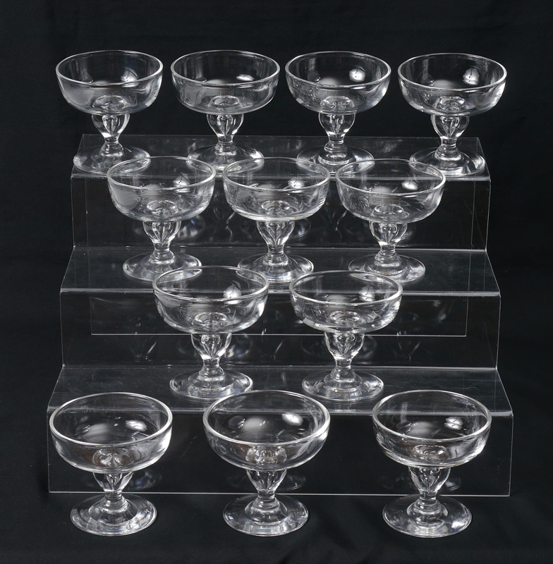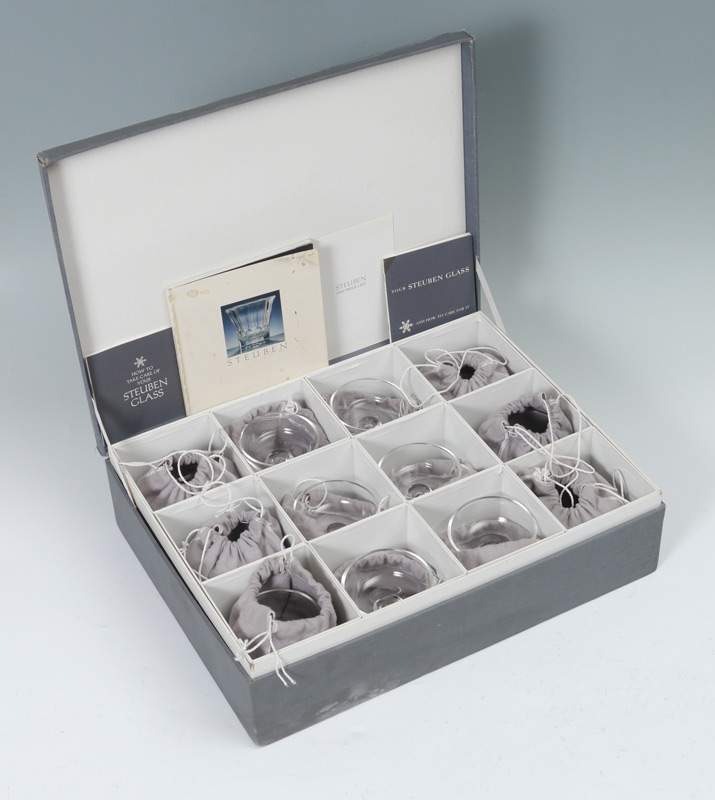 12 STEUBEN CONTROL BUBBLE SHERBETS IN ORIGINAL BOX: Each stem with control bubble center, engraved signed Steuben, 3 3/4'' h. x 4 1/8''. Each comes with purple cloth bag, original presentation box holds all 12, 5 5/8'' h. x 21 1/4'' x 16''.