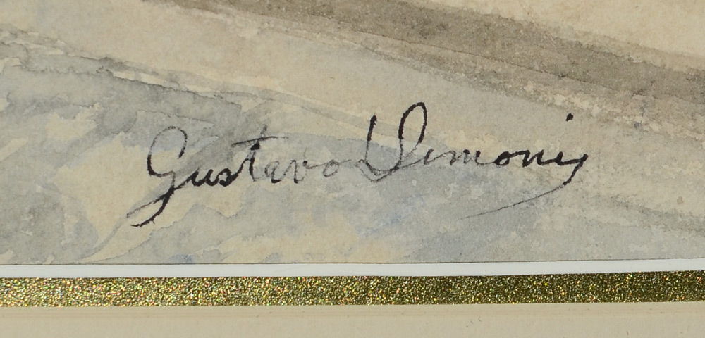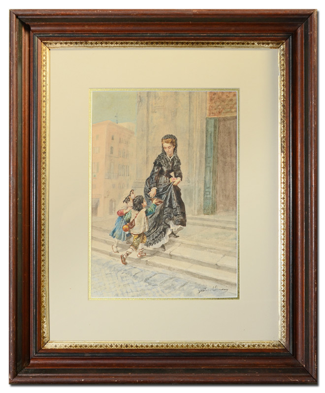 SIMONI, Gustavo, (Italian, 1846-1926): Lady in Black Dress giving Coins to Young Beggars, Watercolor, Sight size 14'' x 9 3/4'', signed lower right, wood frame with wear 24 1/2'' x 20 1/2''.