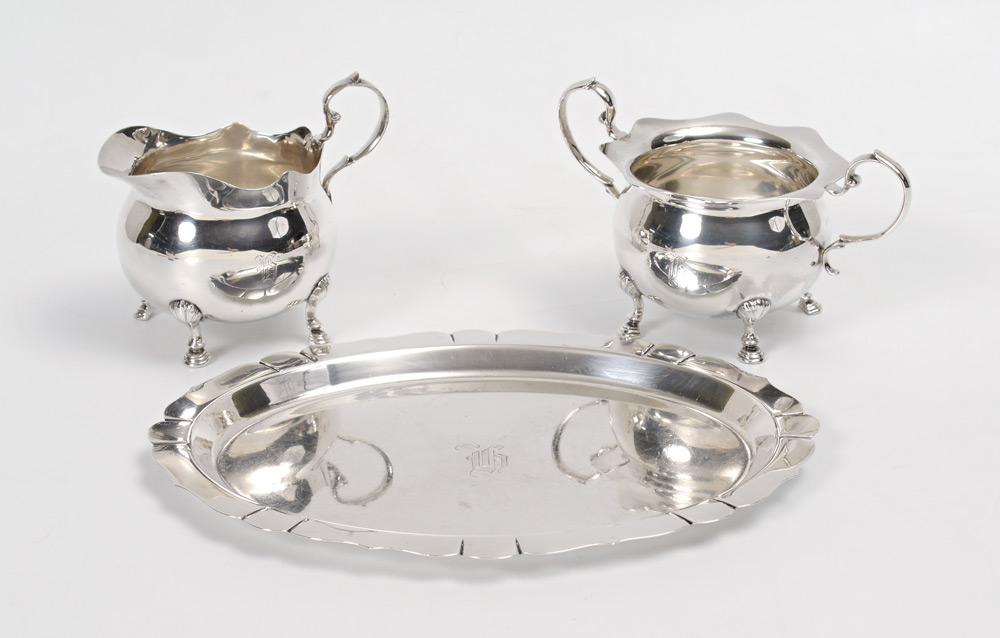 STERLING CREAMER, SUGAR & TRAY: 3 pieces total to include open creamer (4'' h. x 4 7/8''), open sugar (3 3/4'' h. x 6 1/2''), tray (9 3/4'' x 7 1/2''). Each piece marked sterling, no makers mark, monogrammed. Approx. 20.8 troy oz.
