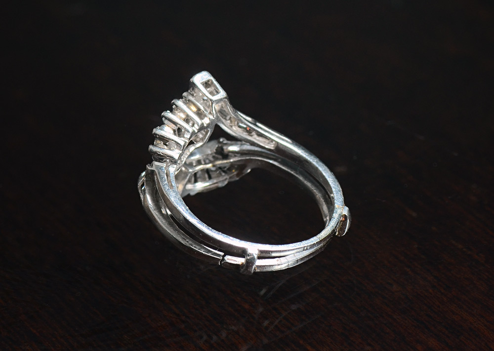 PLATINUM 1.00 CT. DIAMOND INSERT RING: Platinum insert ring contains 22 baguette cut diamonds and 1 triangle cut diamonds totaling approx. 1.00 Ct. The diamonds average VS in clarity and G-H in color, prong and channel set. Needs small solder on band. Weight: 7.5 grams. Size: 8