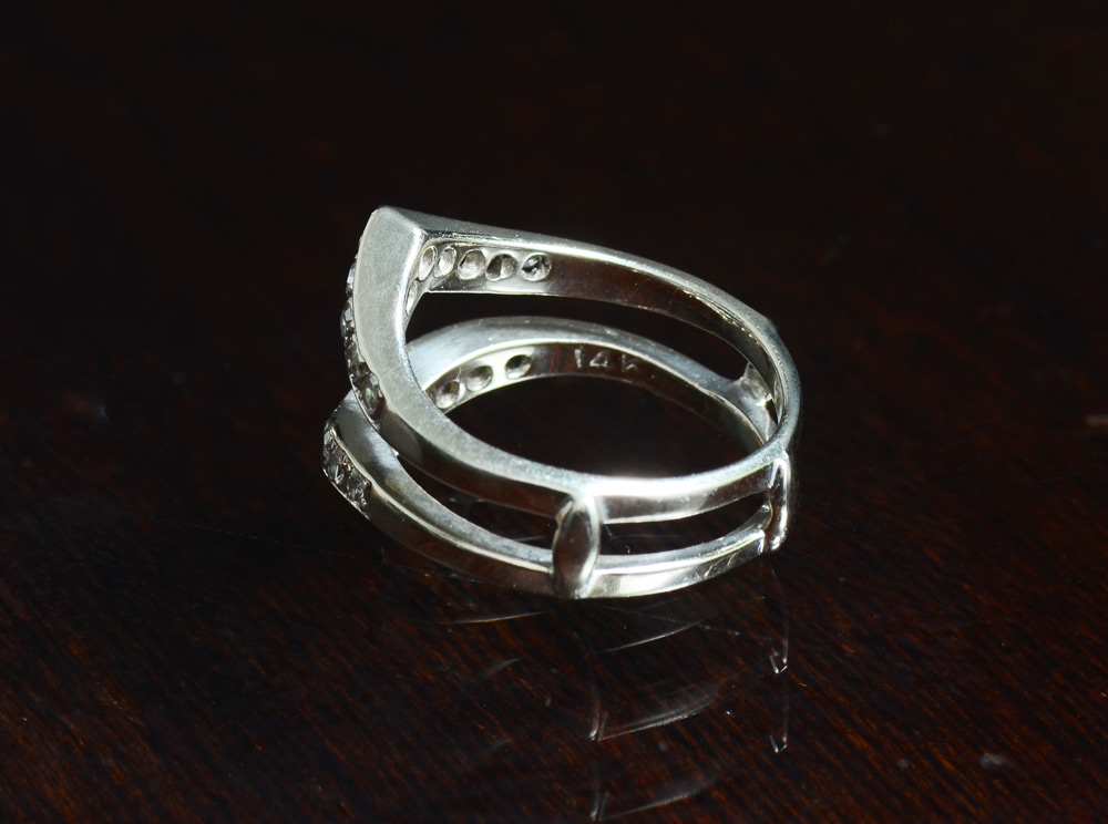 14K DIAMOND RING JACKET: 14K white gold insert ring contains 16 round single cut diamonds and 2 round brilliant cut diamonds totaling approx. .50 Ct. The diamonds average VS in clarity and G-H in color. The diamonds are bead set. Size 7. Weight: 5.9 grams.