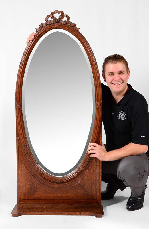CARVED HALL MIRROR WITH SHELF: Carved ribbon crest and carved frame, beveled glass oval mirror above shelf. Overall measures 55 1/2'' h. x 25'' x 9''.