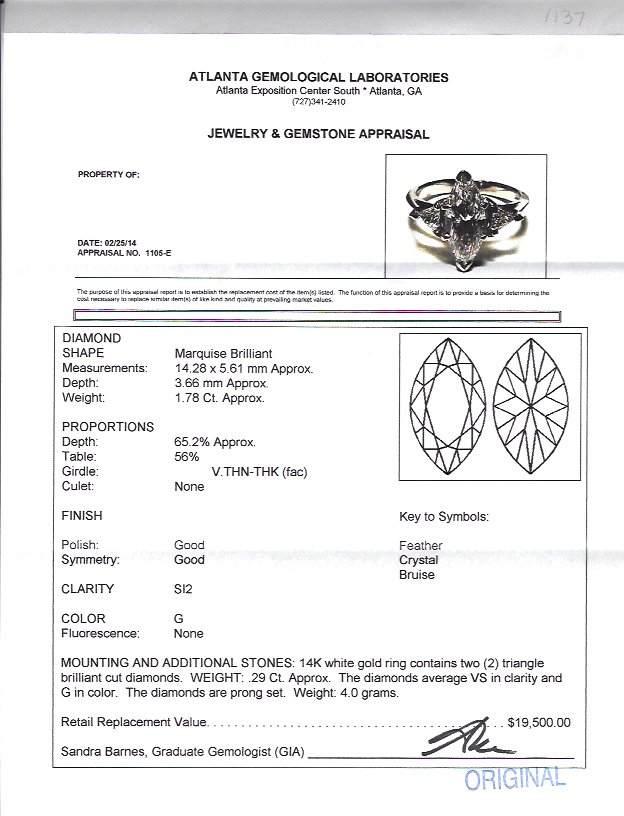 1.78 CT MARQUISE DIAMOND SOLITAIRE WITH 2 TRIANGLE CUT SIDE DIAMONDS: In the center of a 14K white gold ring is an approx. 1.78 Ct Marquise cut diamond of SI2 clarity and G color. Flanked by 2 triangle brilliant ct diamonds totaling approx. .29 Ct., averaging VS in clarity and G color. Sold with current Atlanta Gemological GIA graduate's appraisal for $19,500.