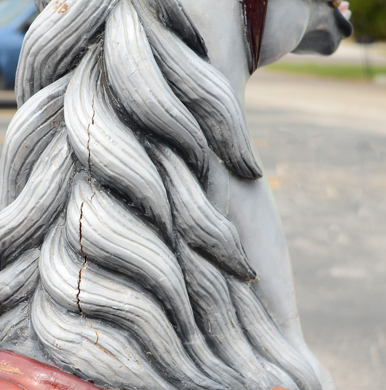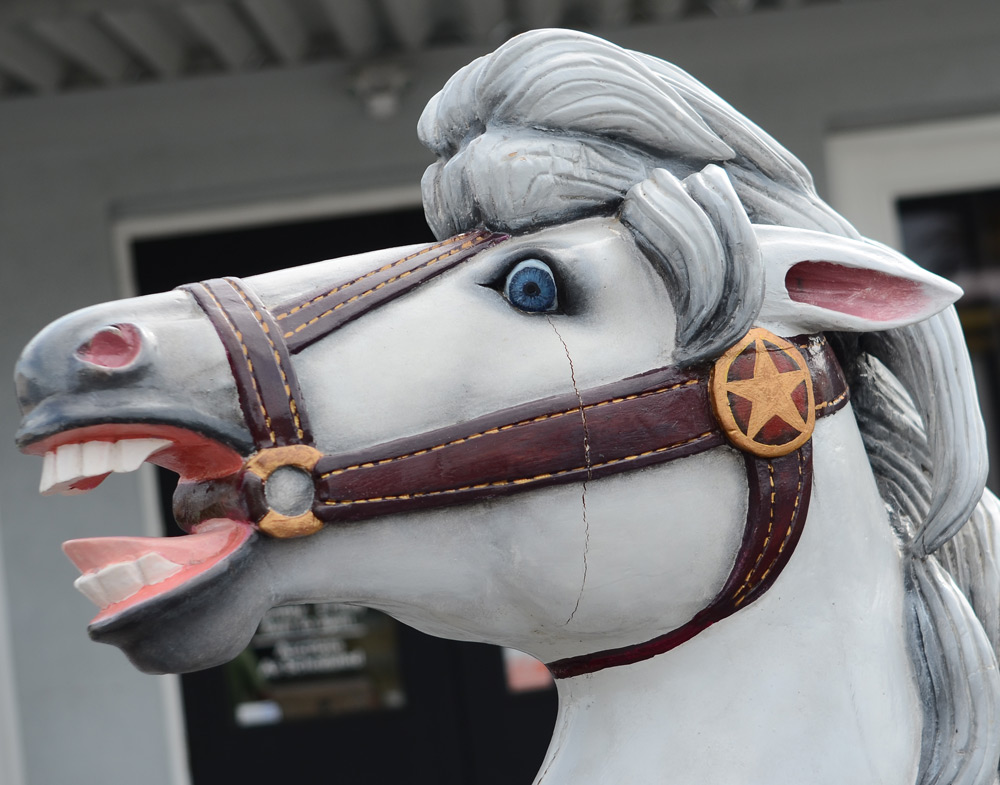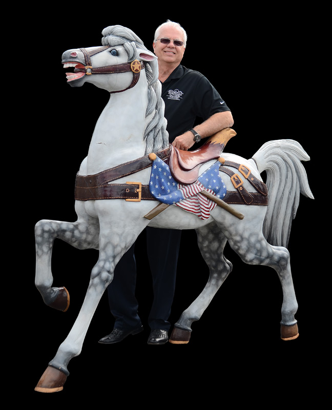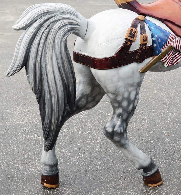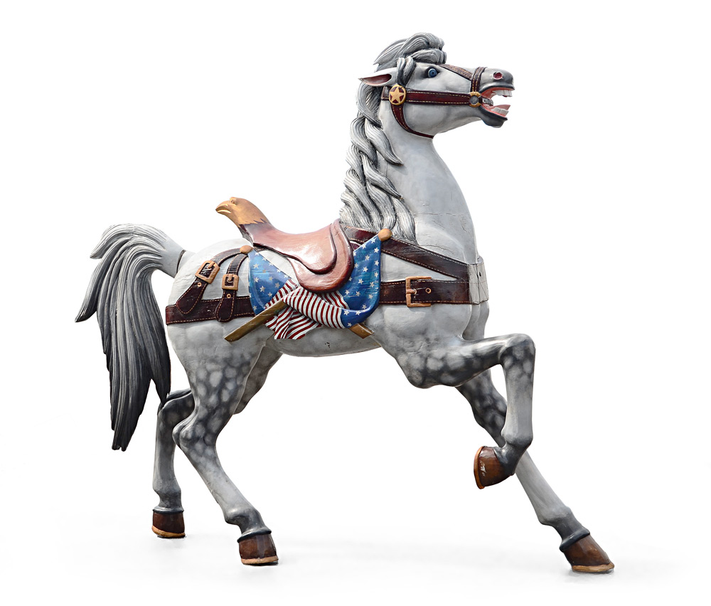 CARVED & PAINTED LIFE SIZE CAROUSEL HORSE: Silver / grey free standing Appaloosa horse with raised front right leg, saddle with an American flag and eagle head. Southeast Asia production, overall measures approx. 67'' h. x 78'' x 15''.