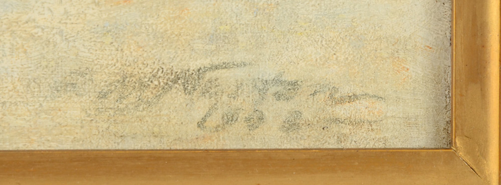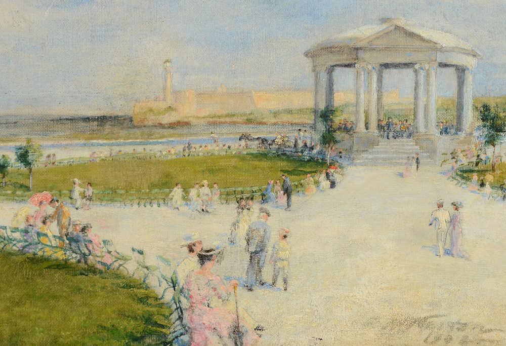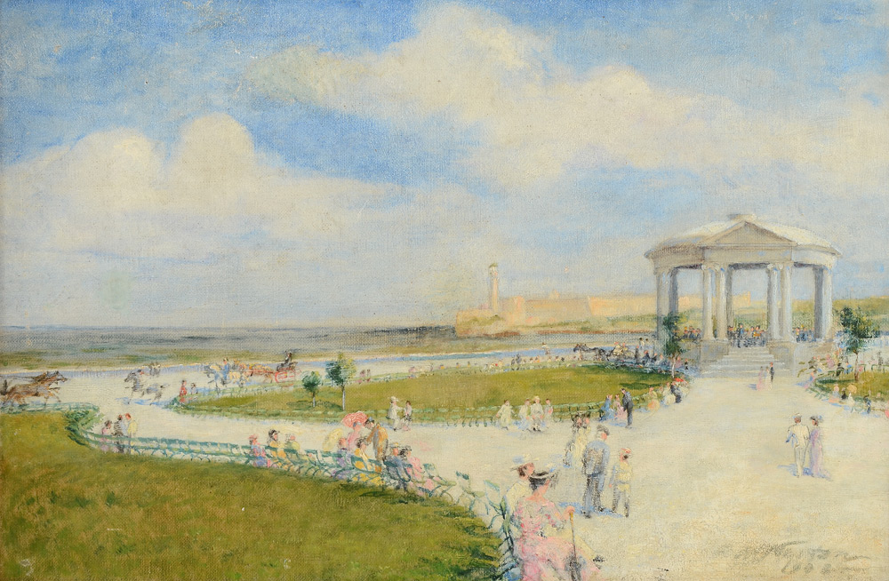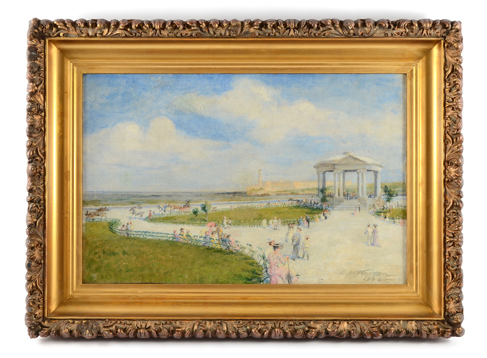 CASTLE MORRO PROMENADE HAVANA CUBA 1908 OIL/CANVAS: Illegibly signed lower right, 11 3/4'' x 17 3/4'', framed with minor wear, 16 1/2'' x 23 1/2''. Possibly William Edward Norton, but we have been unable to match this signature with known Norton signatures, and he is mostly known for marine scenes.