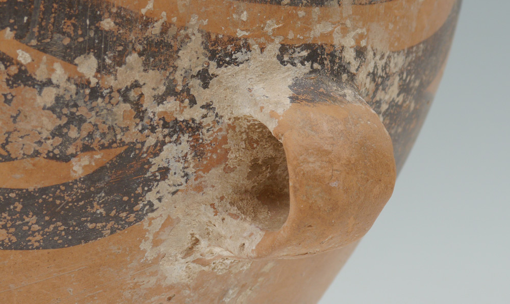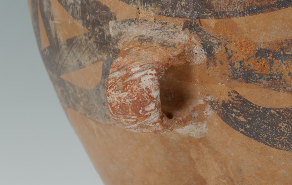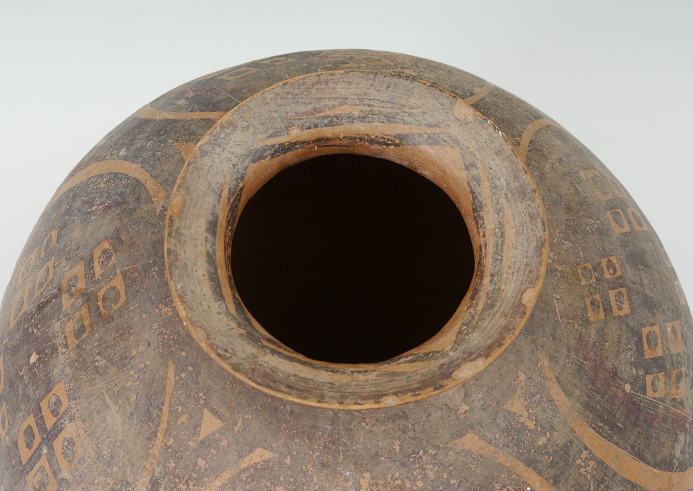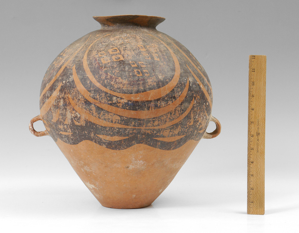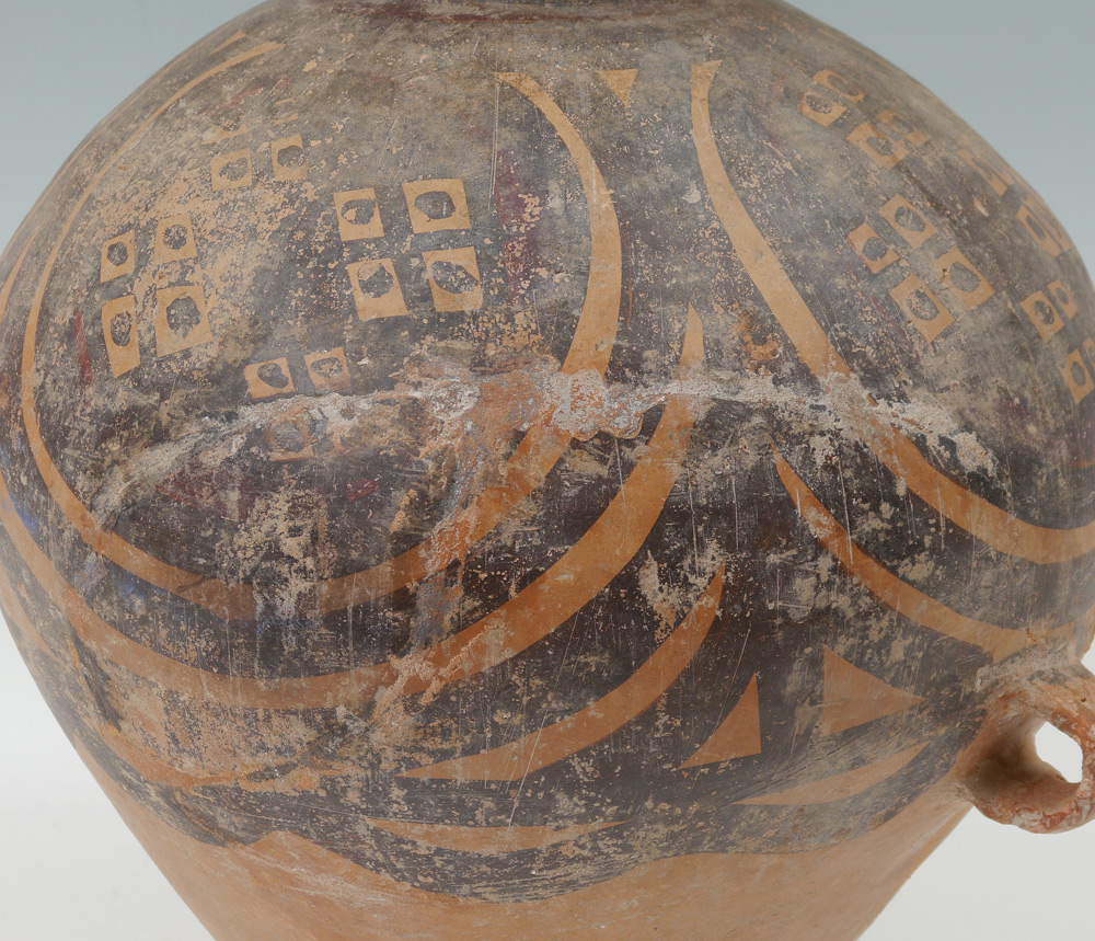 CHINESE NEOLITHIC 2 HANDLED POT: Paint decorated, Neolithic period, 3rd - 2nd century BC. 15 1/4'' h. x 15''.