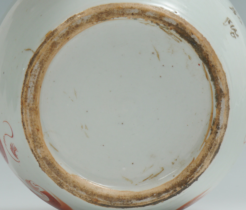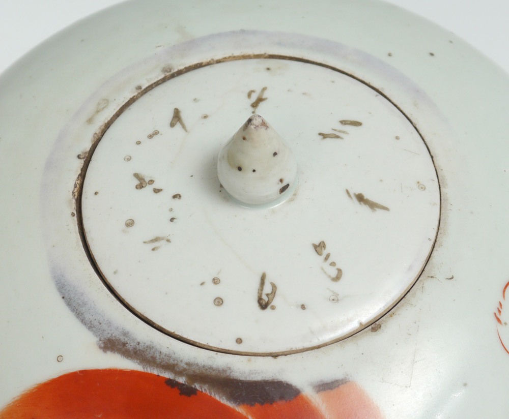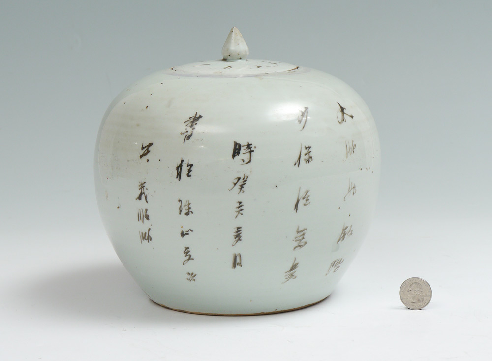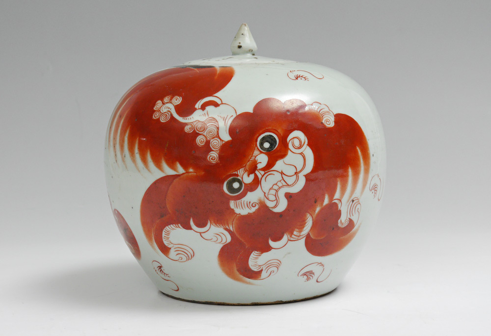 RED FOO DOG DECORATED CHINESE COVERED JAR: Early 20th century Chinese export jar with red foo dog, verses or prayers verso, lid with writing as well. Unmarked on base. Overall 8'' h. x 8 1/2'' dia.