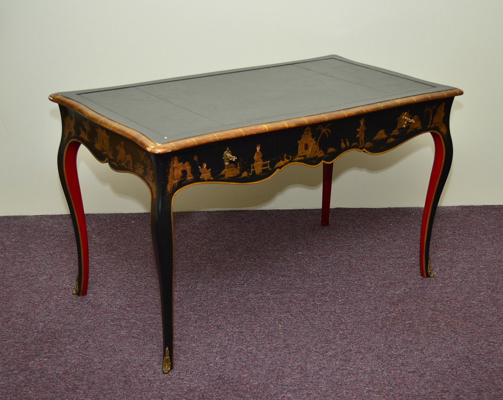 CHINOISERIE DECORATED BLACK LACQUER DESK: Insert embossed leather top with gilt decorated shaped edges. 2 drawer apron with chinoiserie decoration, shaped legs with applied ormolu decoration at feet. 29 3/4'' h. x 50 1/2'' x 29''.