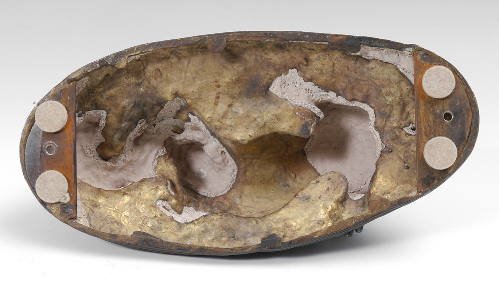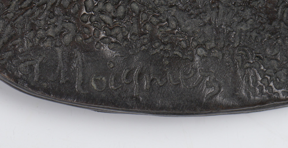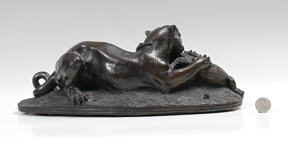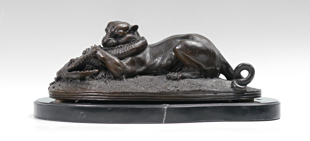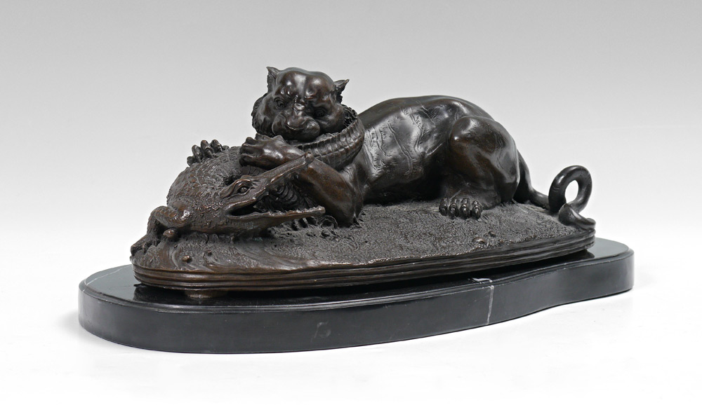 BRONZE TIGER AND CROCODILE AFTER MOIGNIEZ: 5 1/2'' h. x 15'' w. x 7'' d., incised signature to base, sits atop a beveled marble plinth 1 /4'' h. x 17'' w. x 8'' d.
