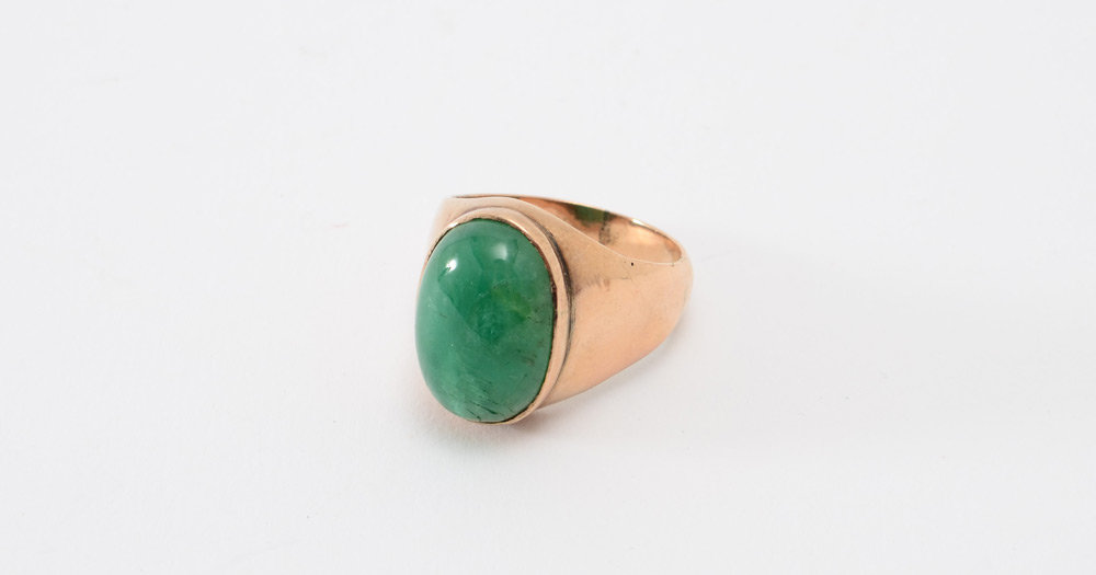 11 CT CABOCHON EMERALD RING: 14K yellow gold ring centers one oval cabochon cut emerald, approx. 11.00 Ct. The emerald is bezel set. Emerald does have a scratch. Weight: 10.3 grams. Size: 9.25
