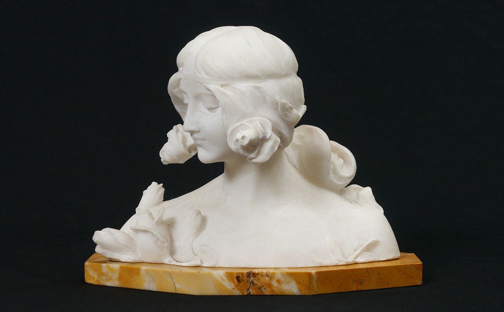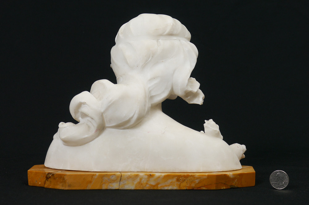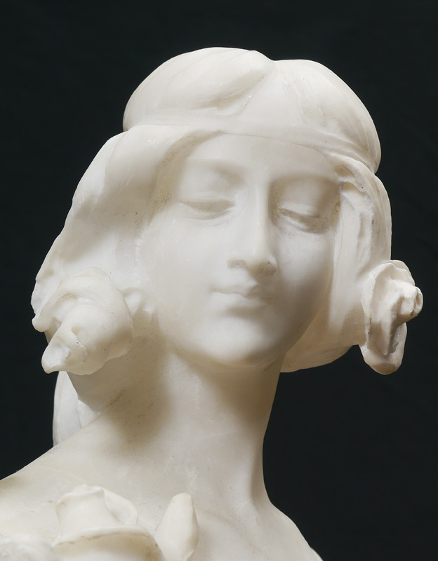 NOUVEAU MARBLE BUST OF A YOUNG BEAUTY: 7 1/2''h x 11''w x 6''d, affixed to repaired pink marble plinth.