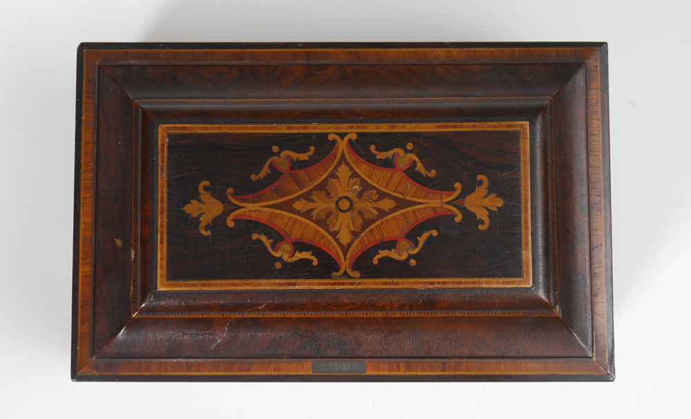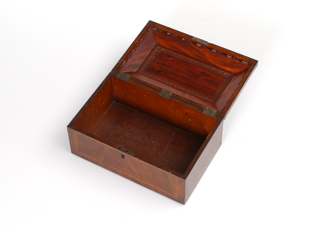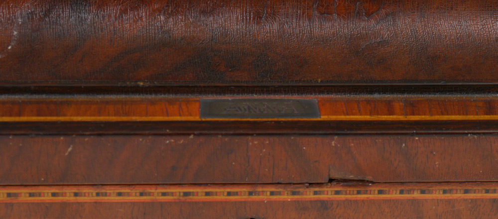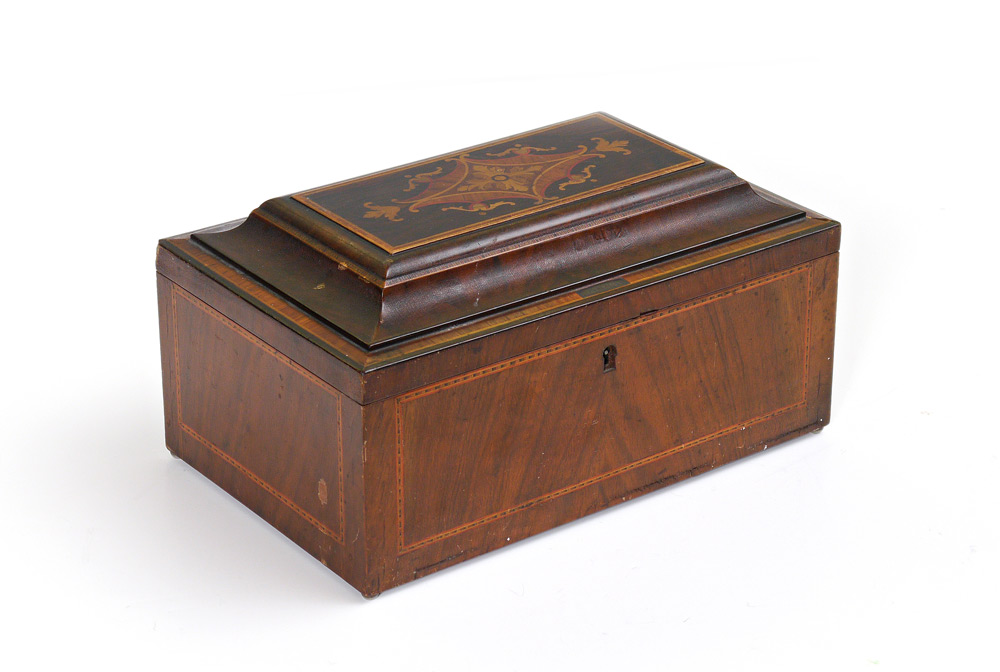 INLAID MAHOGANY TEA CADDY: Hinged lid with marquetry inlay top and small plaque reading Anna, string inlay on sides. Overall measures 5 1/2'' h. x 11'' x 7''.