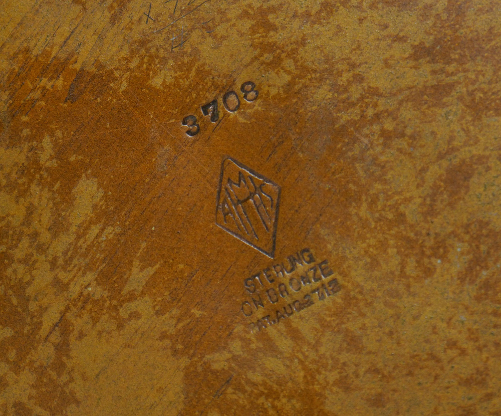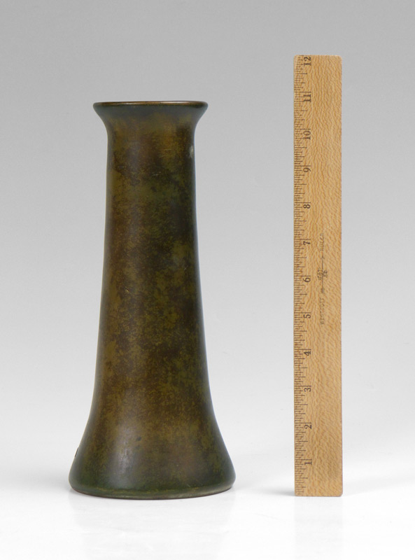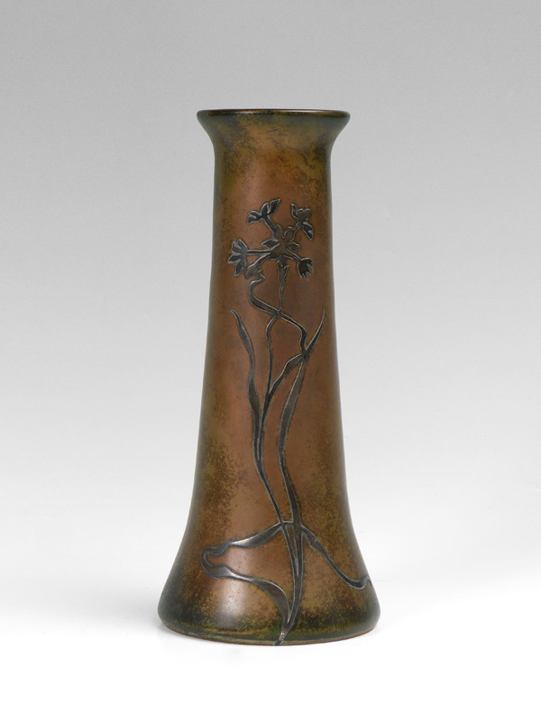 HEINTZ SILVER OVER BRONZE ART METAL VASE: Flared rim, tapered body and flared base with applied silver floral decoration. Marked on base with Heintz Art Metal hallmark, 3708, Sterling on Bronze and patent date. 10 7/8'' h. x 4 3/4''.