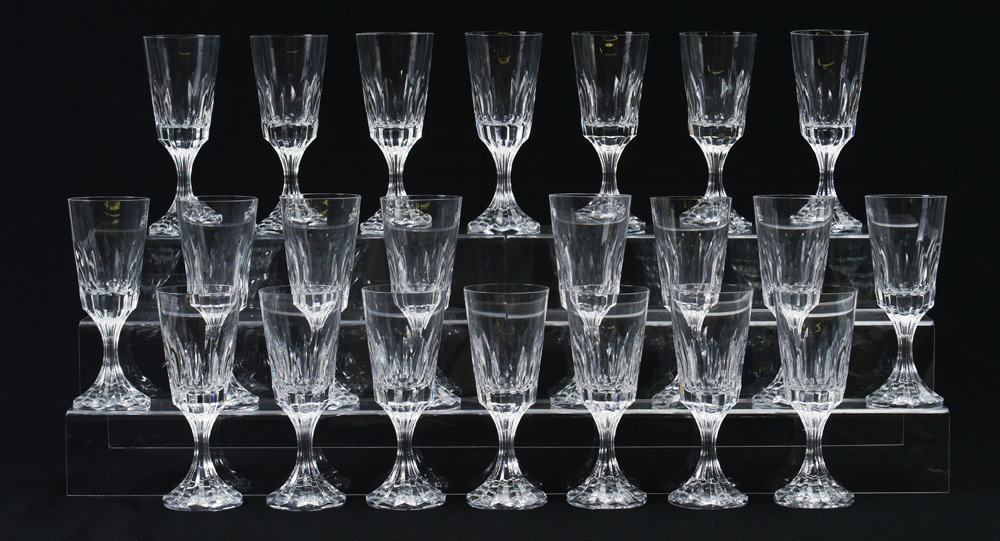 BACCARAT CRYSTAL PATTERN D'ASSAS 22 WATER GLASSES: Water glasses, each marked with Baccart mark, 7 3/4'' h. Sold with 3 original Baccarat boxes holding 6 each, 9 1/2'' h. x 13'' x 9''.