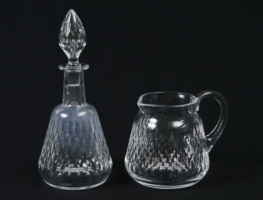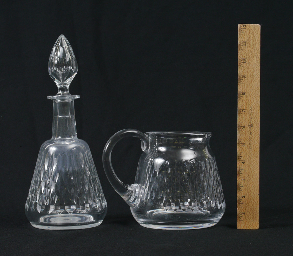 BACCARAT CRYSTAL PATTERN D'ASSAS WATER PITCHER & DECANTER: 2 pieces to include 1) Decanter with stopper, overall 11 3/4'' h. x 5''. 2) Handled water pitcher, 6'' h. x 7 1/2''.