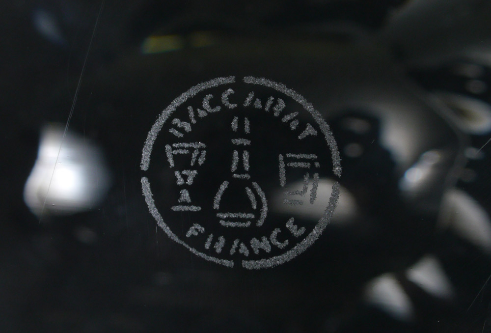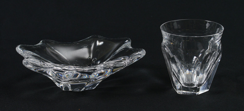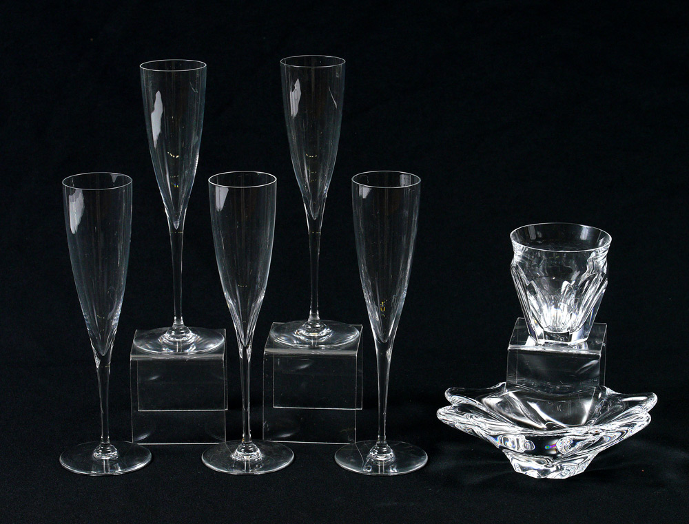 7 PIECE ASSEMBLED BACCARAT CRYSTAL COLLECTION: 7 pieces total to include 5 champagne flutes (9 1/4''), candy dish (2 1/4'' h. x 7'' x 5''), diminutive vase (3 1/2'' h. x 3 1/4'')