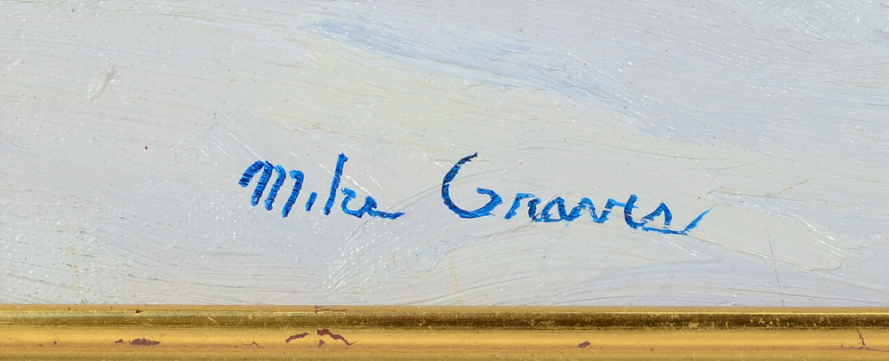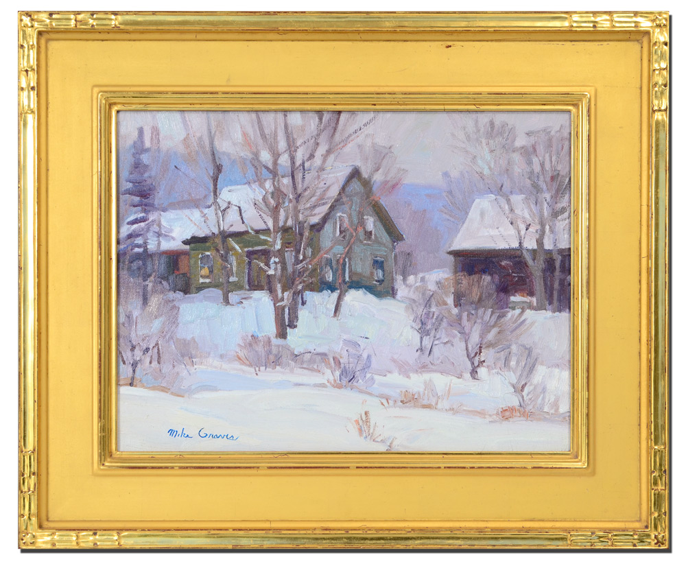 GRAVES, Michael, (American, 1952-): Snowy Winter Landscape with Homestead, Oil/Canvas, 12'' x 16'', signed lower left, encased in custom carved and gilded Goodnow impressionist frame 18'' x 22''.