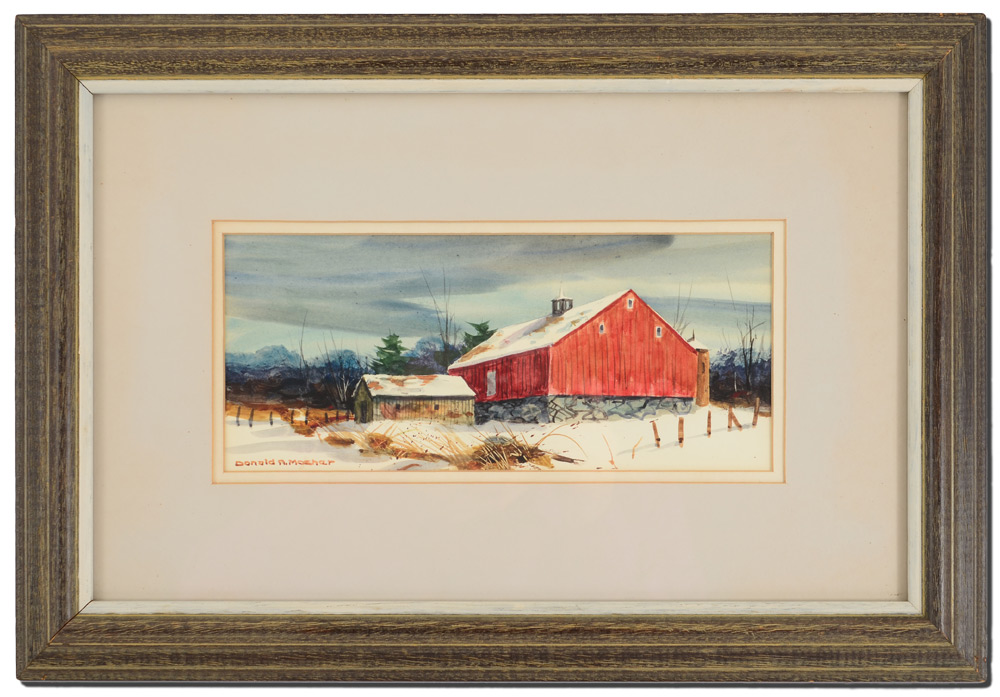 MOSHER, Donald A., (American, 20th Century): Red Barn in Winter, Watercolor, Sight size 4 1/2'' x 10 1/2'', signed lower left, original wood frame 13'' x 18 1/2''