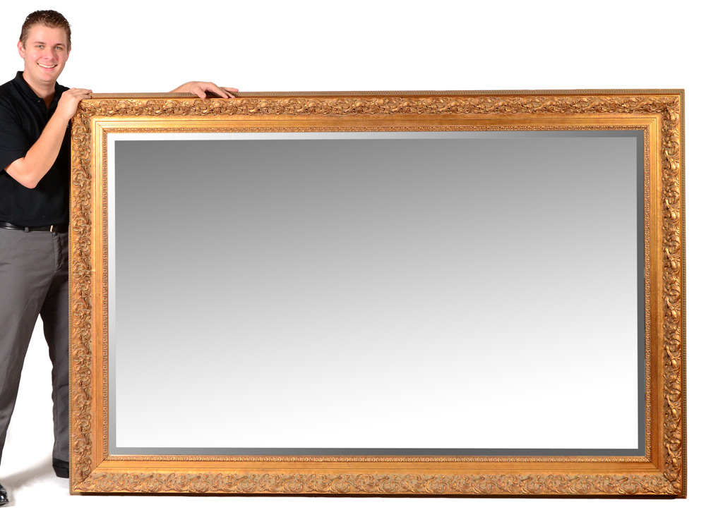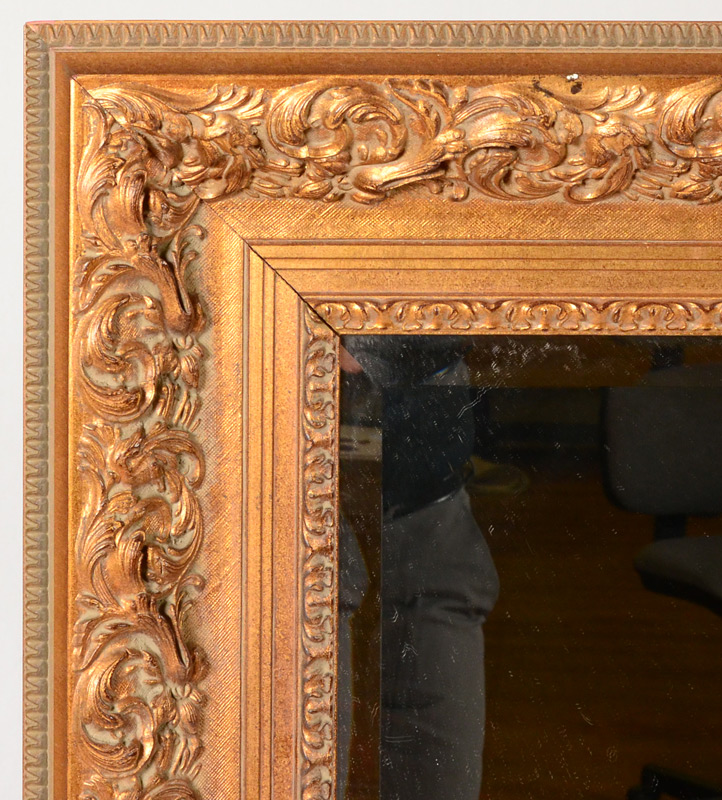 PALATIAL GILT WOOD FRAMED MIRROR: Carved foliate motif gilt wood frame, beveled glass mirror. Frame overall 59 1/2'' x 91 1/2'', sight size mirror 47 1/2'' x 79 1/2''.