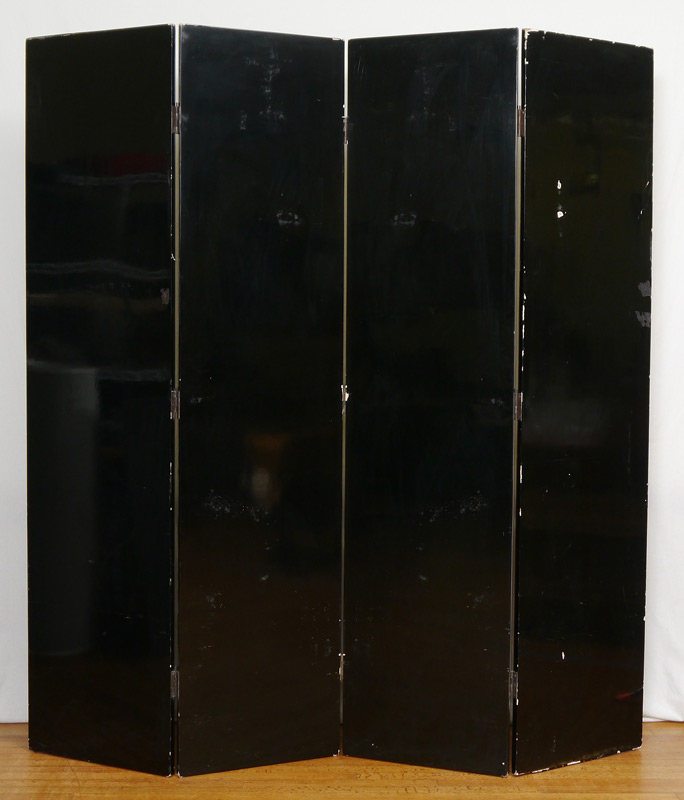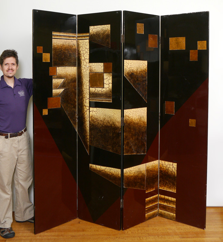 CONTEMPORARY DESIGN 4 PANEL FLOOR SCREEN: Black and red lacquer with faux metallic geometric designs. Each panel 84 1/4'' h. x 20''.