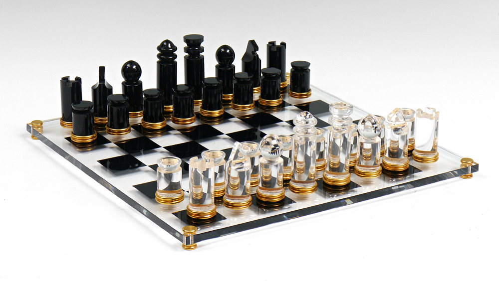 MODERNIST LUCITE CHESS SET: Black and clear pieces with gold toned trim, with Lucite game board. Kings measure 3 1/5'', board 15 3/4'' x 15 3/4''.