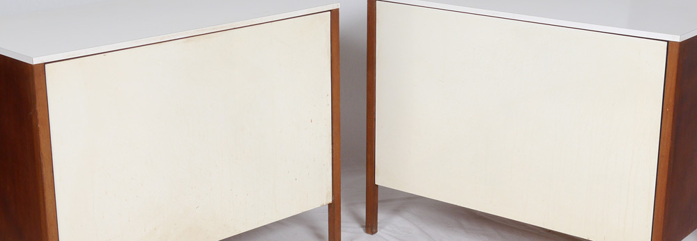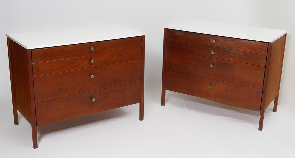 PAIR FLORENCE KNOLL 4 DRAWER DRESSERS: With formica top and back, 4 graduated drawers. Label on bottom. Overall 29 1/2'' h. x 37'' x 19 1/2''.