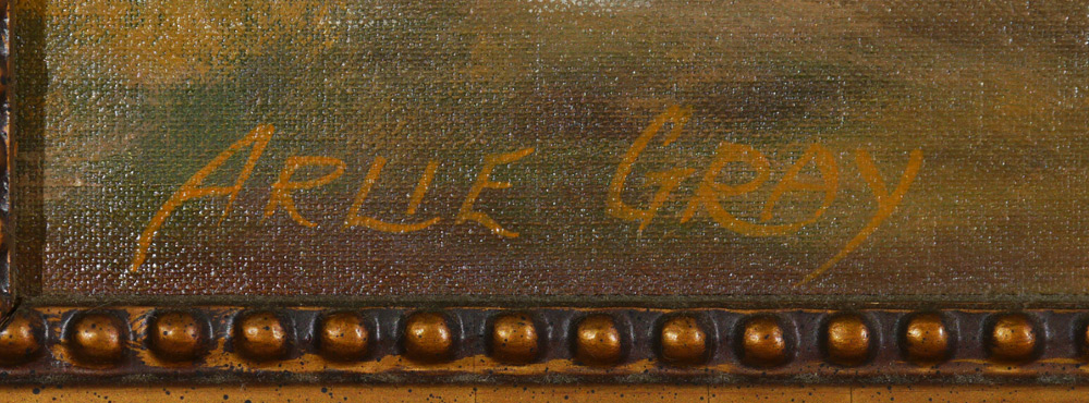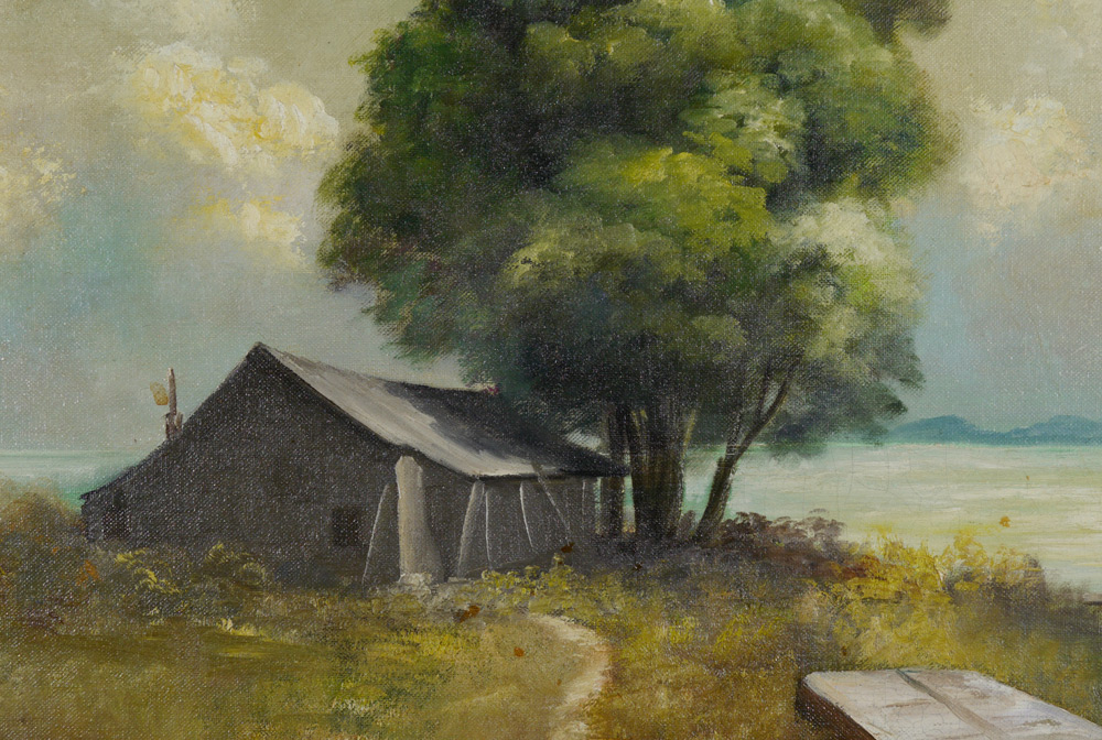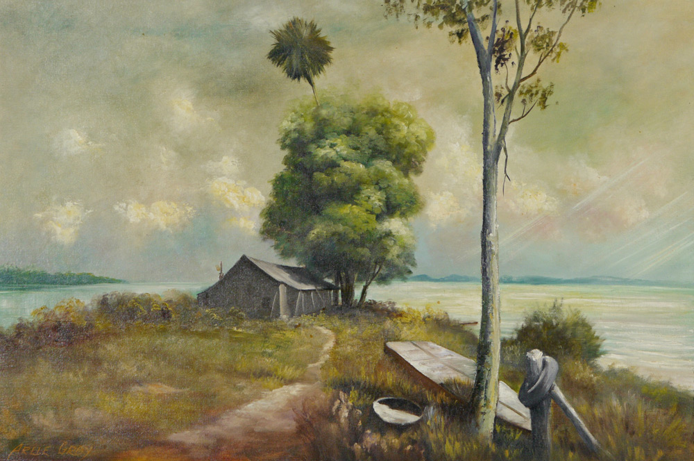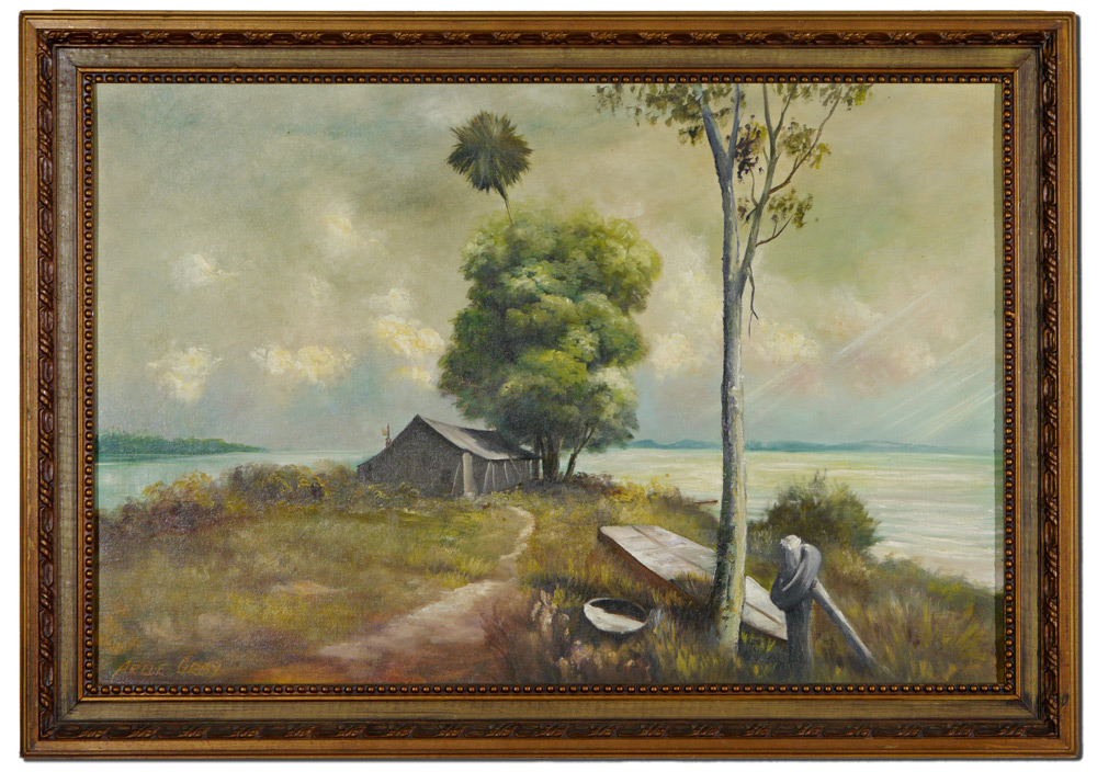 GRAY, Arlie, (American, 20th Century): Seaside landscape with fishing shack and boat, Oil/ Canvasboard, signed lower left, 24'' x 36'' framed 29'' x 41''. Local Sarasota Artist.