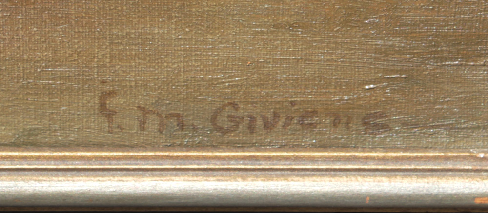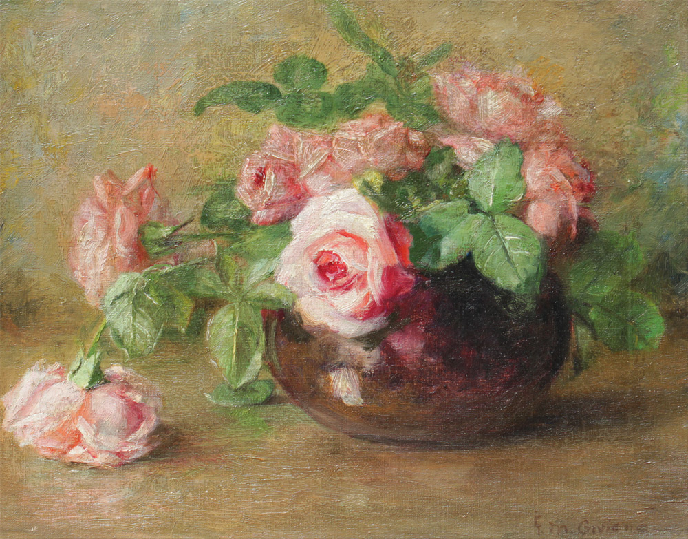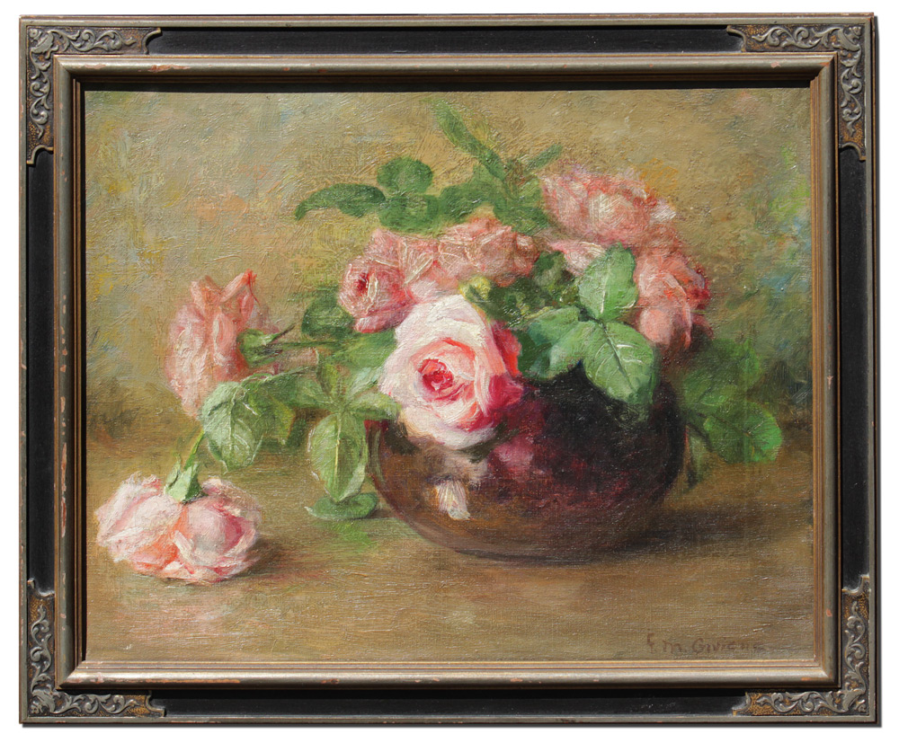 GIVIENS, Florence May, (American, 1915- ): Still Life of Roses in a Vase, Oil/Canvas, 11'' x 14'', signed lower right, encased in period carved frame with minor wear 13 1/4'' x 16''.