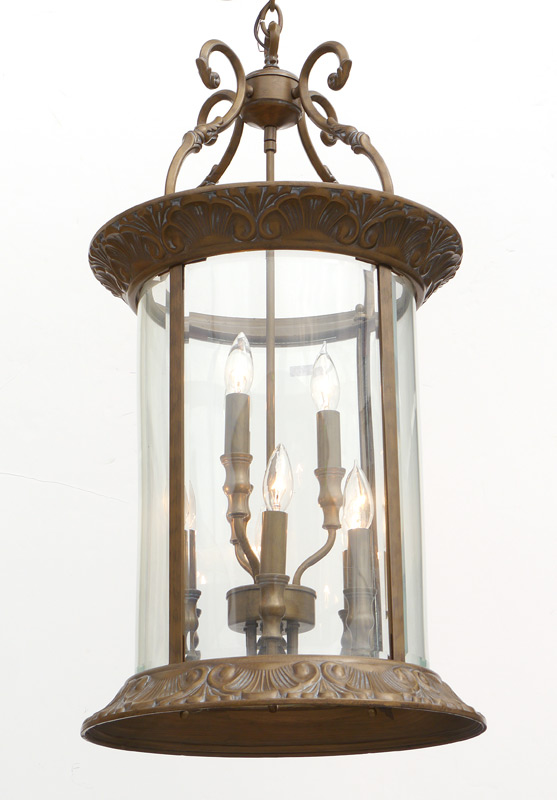 EMBOSSED ROUND BRASS 8 LIGHT CHANDELIER: Embossed top and bottom rim, 4 bent glass panels center. 8 lights on 2 levels, overall 31'' h. x 16''.
