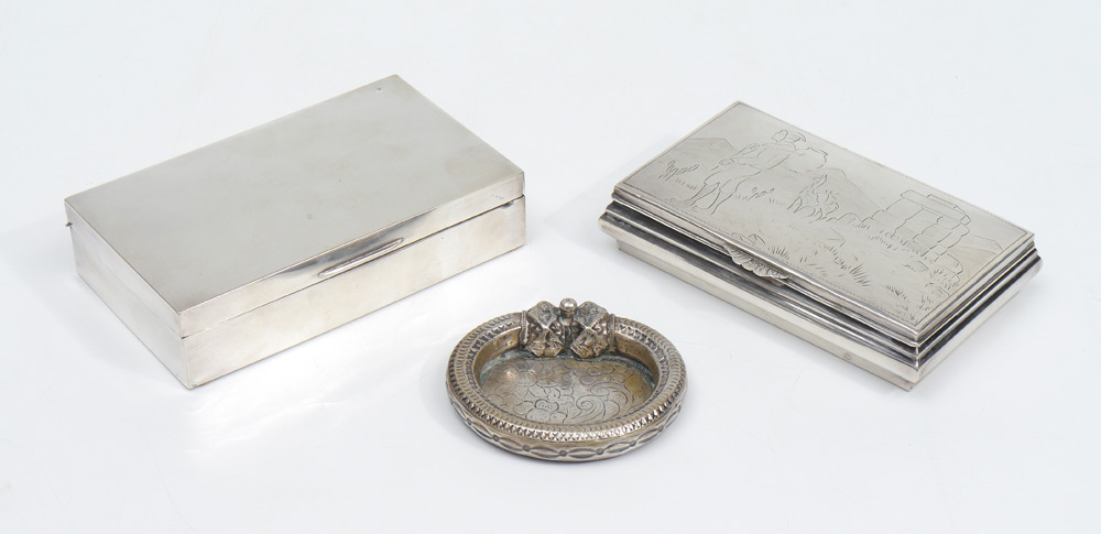 2 STERLING SILVER BOXES & PIN TRAY: 3 pieces total to include 1) Mappin & Webb, 1920, box with hinged lid, wood lined interior, 1 5/8'' h. x 6 1/4'' x 4''. 2) Peruvian box with engraved man with llama at ruins decoration on hinged lid. Marked 925 CR Peru, 1 1/2'' h. x 6 3/8'' x 4''. 3) Egyptian ring tray, embossed rim, engraved center. 1'' h. x 3 3/4'' x 3 /12''. Overall weight with wood liners included, 27.8 troy oz.