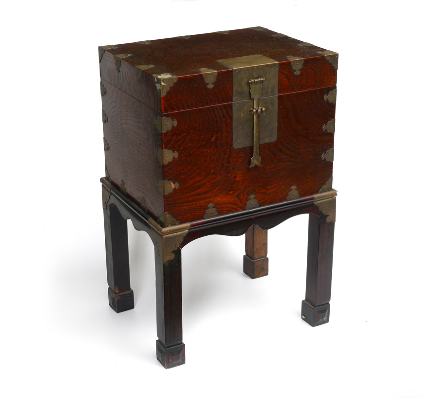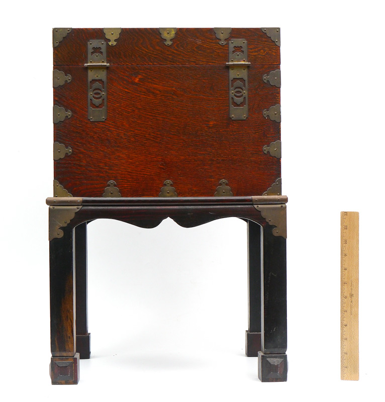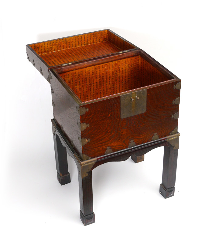 TAMO WOOD BOX ON STAND: Japanese ash or Tamo box with hinged lid, applied brass decoration and hardware. Paper lined interior with kanji. 12 1/4'' h. x 16 1/4'' x 12 3/4''. Stand with shaped skirt, 13'' h. x 17'' x 13 1/4''.