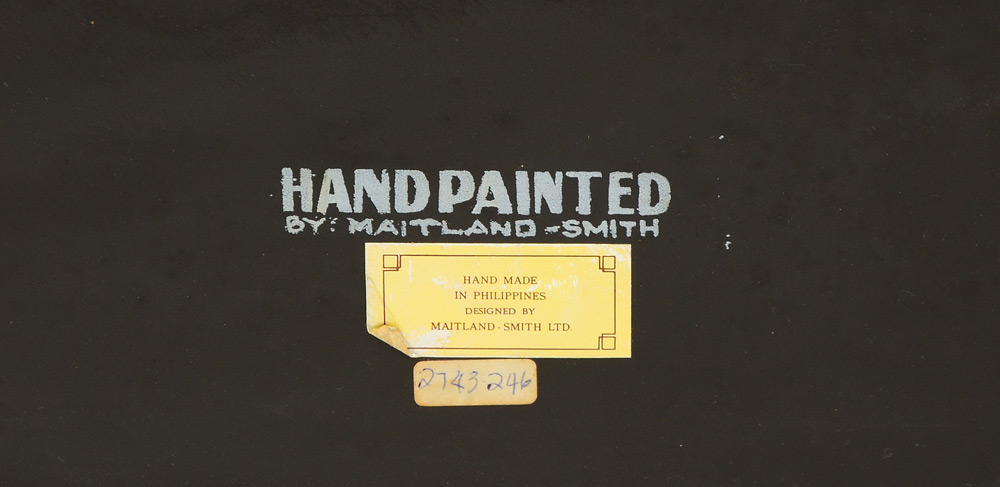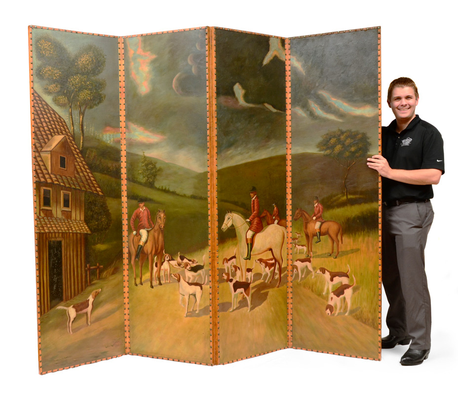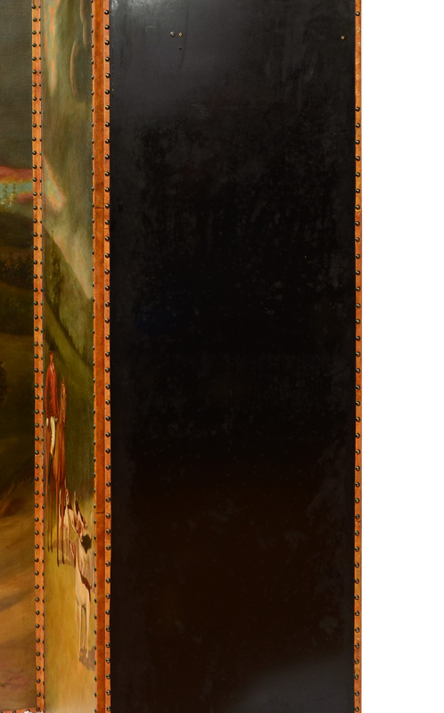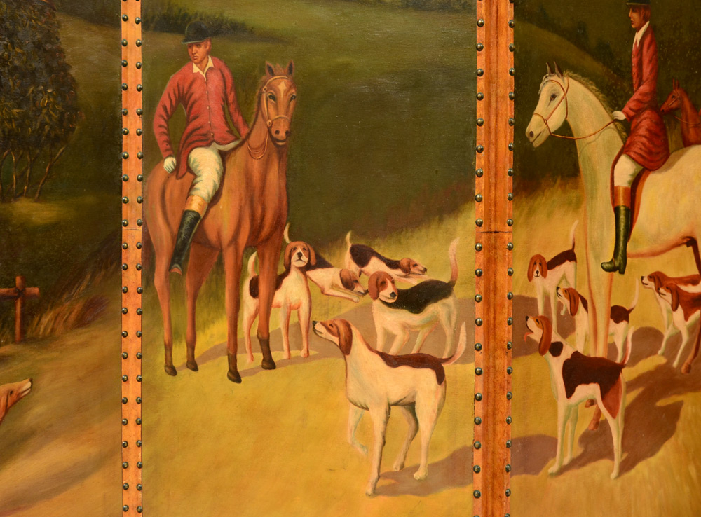 MAITLAND-SMITH PAINTED 4 PANEL FLOOR SCREEN: Overall scene of English fox hunt with riders and dogs. Marked Handpainted by Maitland-Smith on back. Overall each panel 84 1/4'' h. x 24 1/4''.