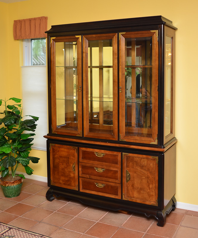 BROYHILL PREMIER CHINA CABINET: With an oriental design, illuminated top section with mirrored back, 2 glass shelves, beveled glass to doors and center section. Base with 3 central drawers, 2 side doors, carved skirt and shaped feet. 79'' h. x 55 1/2'' x 18''.