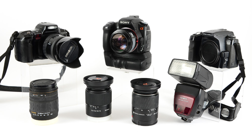 LARGE COLLECTION OF CAMERAS & LENSES: Lot to include Sony Alpha 350 DSLR 14.2 megapixels, Minolta 50mm f1.4 AF Prime lens, Sony Alpha 18-70 f3.5-5.6 kit zoom, Minolta 5200i hotshoe flash, Sony Alpha Battery grip, Quantaray 18-200mm AF zoom, Konica Minolta AF DT 18-70 kit zoom, Konica Minolta AF 28-105 zoom, Minora Maxim 700 si 35mm body, Minora Maxim 5D DSLR body, assorted extras / bags / tripod.