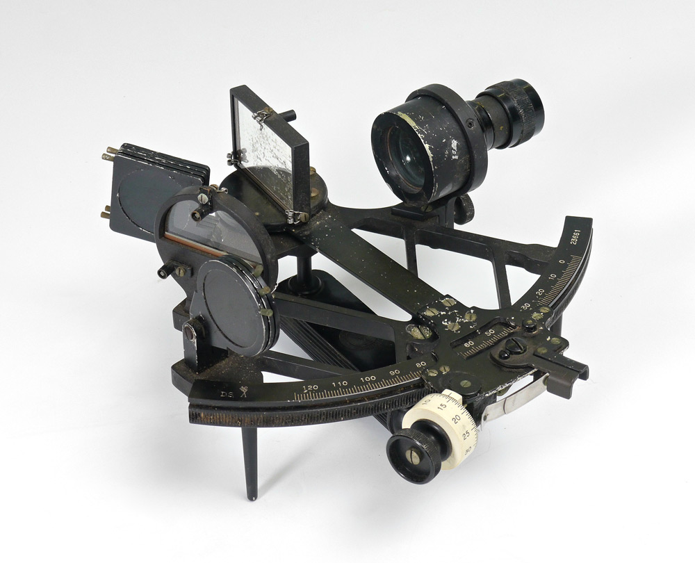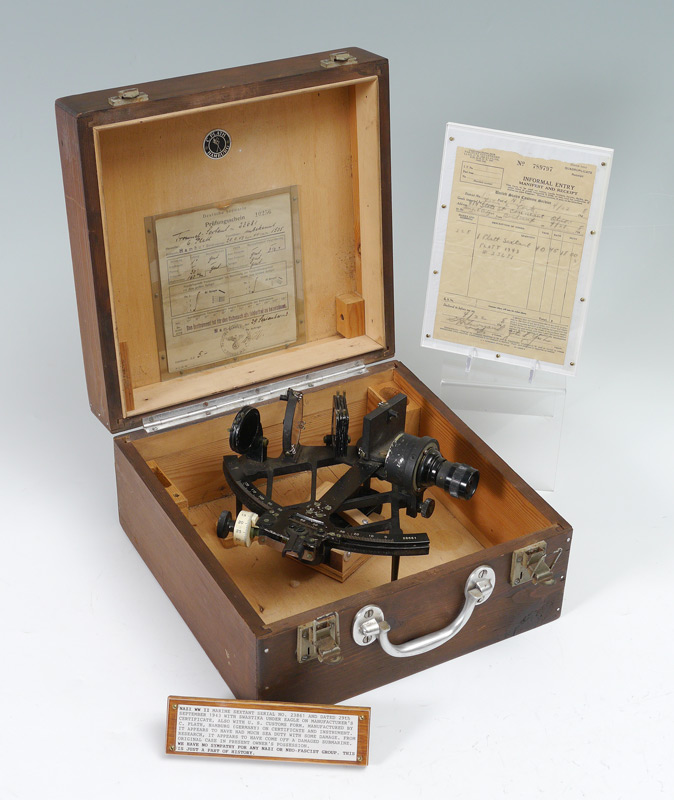 C. PLATH WWII GERMAN NAVAL SEXTANT: WWII era sextant with original German paperwork dated Sept. 29th, 1943 and US customs form dating 1948. Sold with original case 7'' h. x 12 1/2'' x 13''.