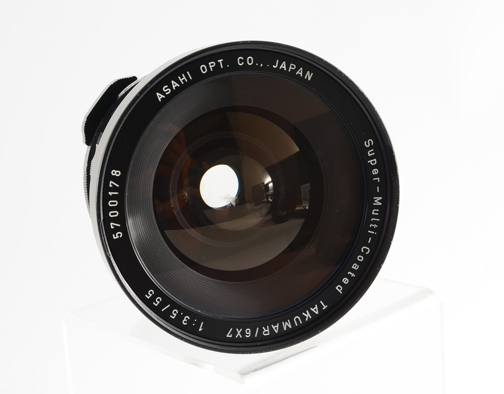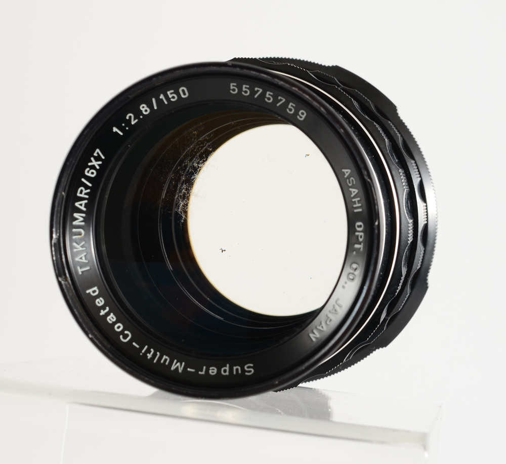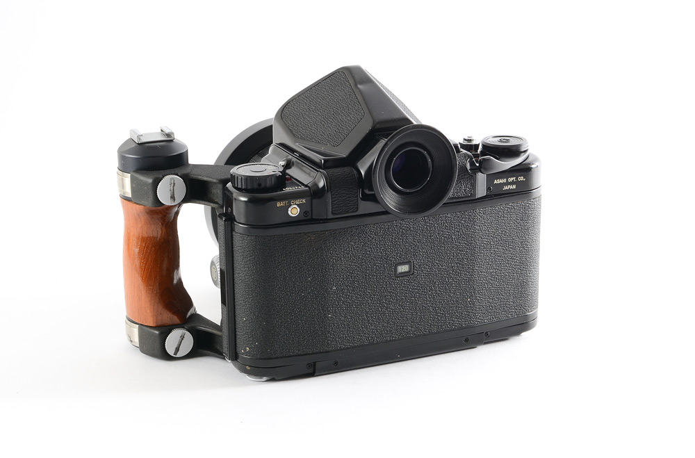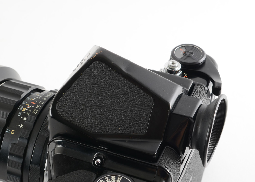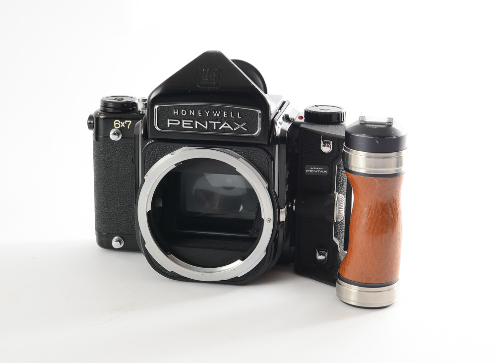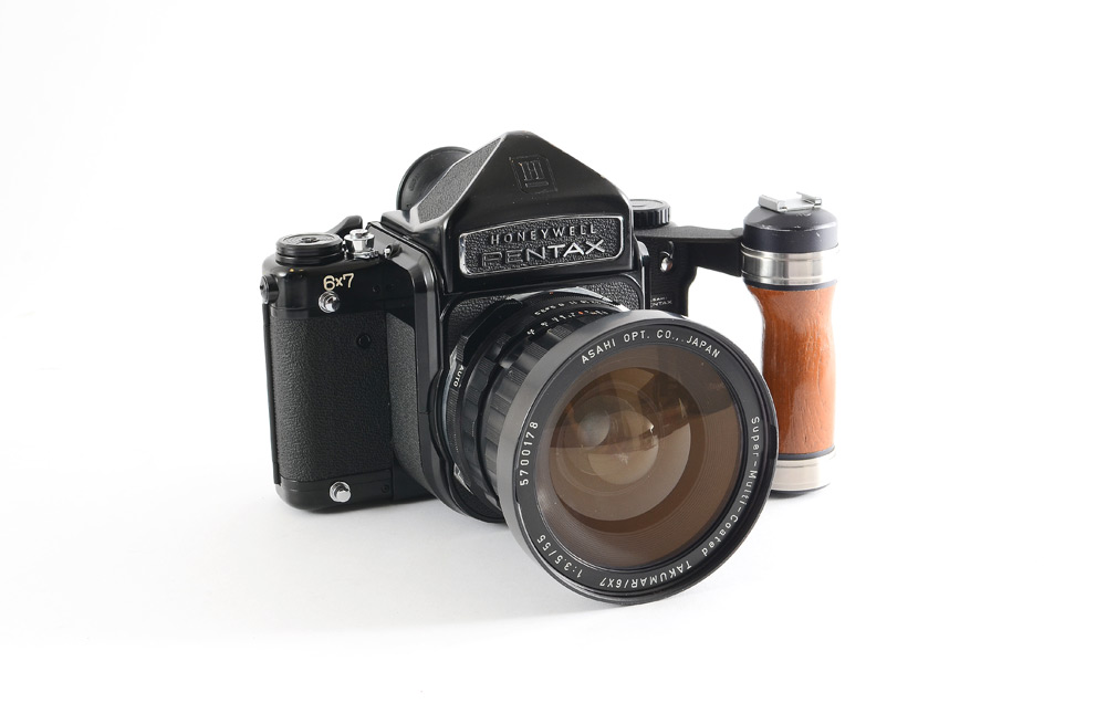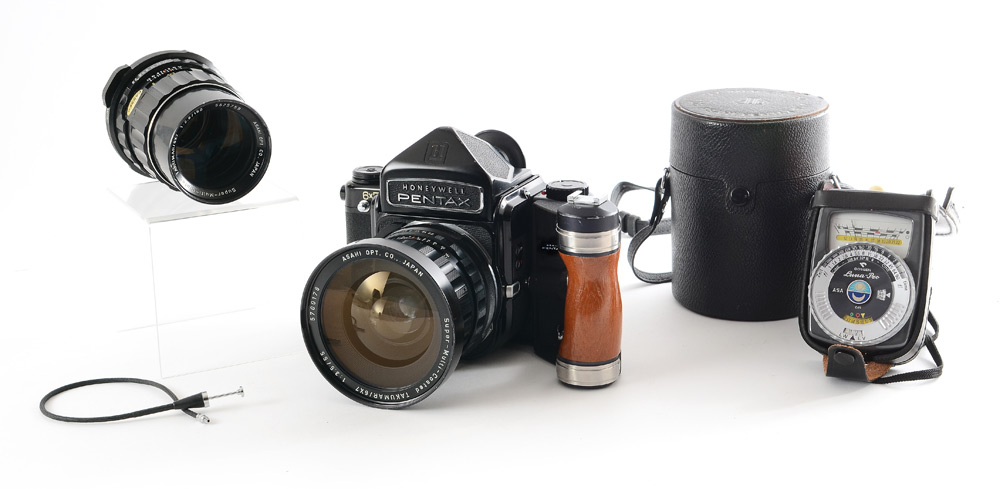 PENTAX 6 X 7 CAMERA W/ CASE, 55 & 150 MM LENSES AND ACCESSORIES: Medium Format film camera containing: 1) Honeywell Pentax 6 x 7 with optional prism viewfinder and wooden grip/hotshoe. 2) 55mm f3.5 and 150mm f2.8 Takumar lenses. 3) Gossen Luna-Pro light meter. 4) Off-camera shutter trigger. Tripod and leather carry case included.
