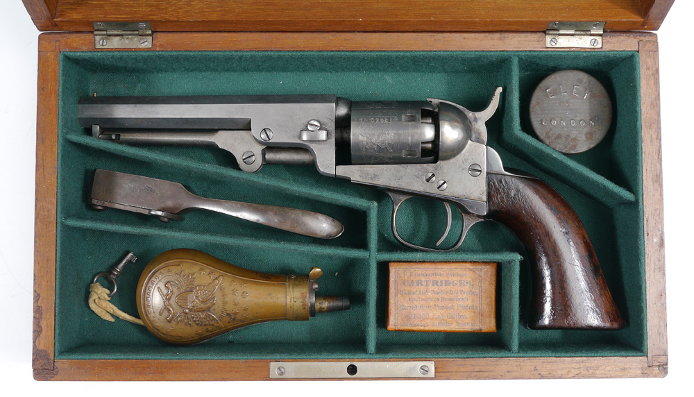 CASED COLT POCKET REVOLVER PISTOL: 31 caliber 5'' barrel, all matching serial number 200292, walnut grips, trigger guard and backstrap retain 90%+ of silverplate finish. Cylinder scene fine, action currently works and tight. Sold with a case to include period brass powder flask with eagle and emblem, bullet mold, Eley metal cap box, reproduction box of cartridges. Overall a nice presentation.